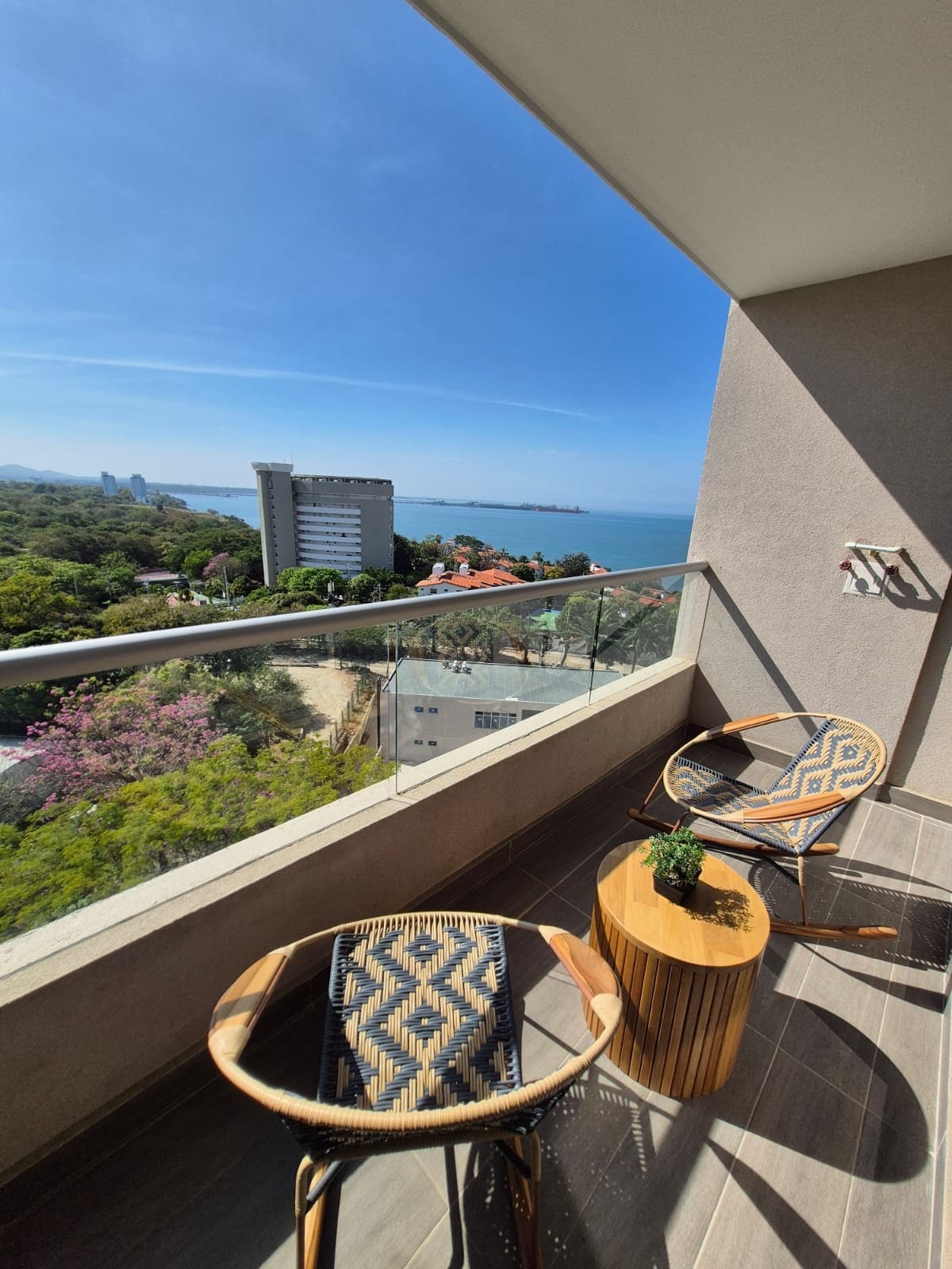 Balcón en el piso 18, vista al mar, playa privada y piscina