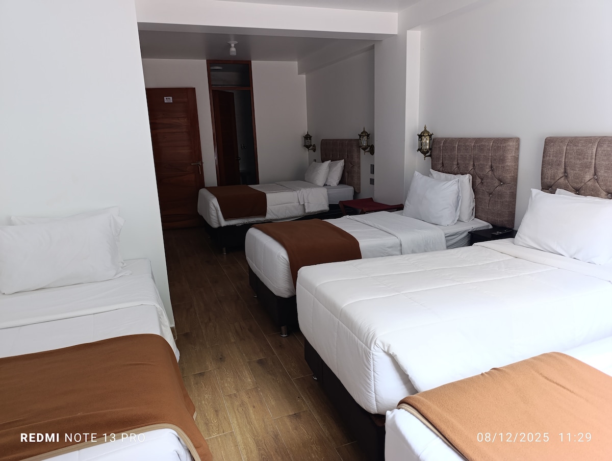 Relájate con toda la familia en este alojamiento con toda tranquilidad. Ofrecemos servicio de Habitaciones: Matrimoniales, Dobles, triples, Cuadruples. cómodas habitaciones todas con baños privados y kit de aseo, contamos con Wifi, TV Cable, Agua caliente las 24 horas, servicio de storage gratis. Incluye desayuno apartir de las 5:00 am a 9:00 am. Recojo de la estacion al establecimiento, estamos en la Av. Pachacutec # 704 camino a los baños termales. Personal amable e información turística.