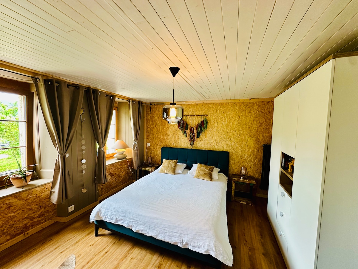 Alójate en el Nid'Amour, en el corazón del Val-de-Travers, tierra de senderismo, ajenjo y alta relojería. Después del esfuerzo, relájese en el jacuzzi interior o junto a la chimenea. Ideal para un fin de semana romántico o una escapada familiar. La terraza amueblada invita a la relajación, entre un cálido salón y una zona de barbacoa ideal para disfrutar de momentos gourmet con total tranquilidad.