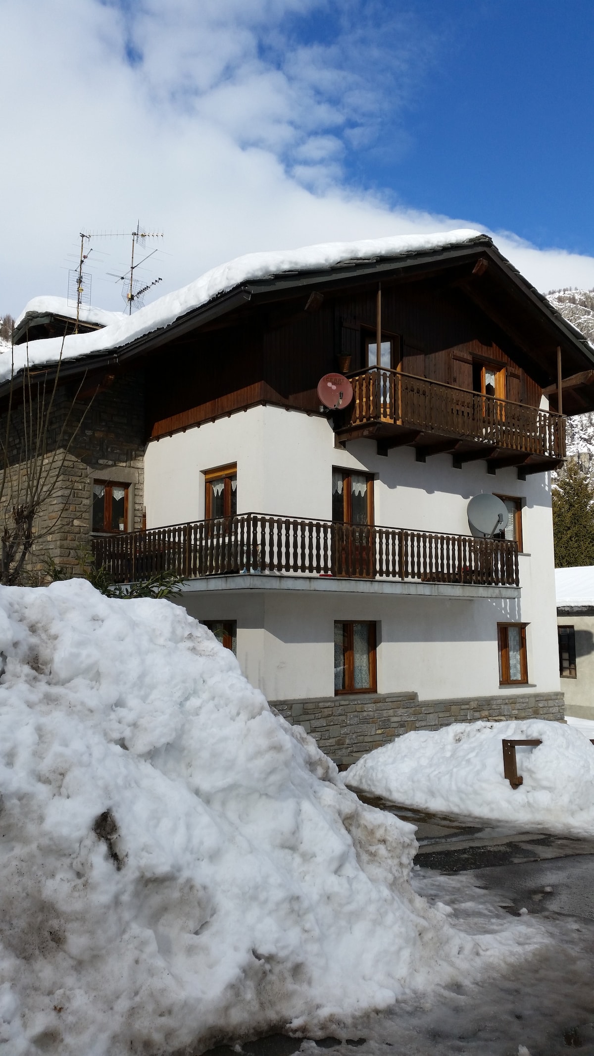 Porción independiente en un pequeño chalet a 1,5 km desde el centro de Courmayeur. Acceso a pie desde un camino de 200 metros de largo, maravillosa ubicación en el borde del bosque con vistas al Mont Blanc, sin casas cerca. Pequeño pero acogedor estilo de cabaña artesanal, aprovechando al máximo los espacios. Calefacción independiente. 1 cama matrimonial + 1 sofá cama por tercer huésped. (+ 20 € por sábanas adicionales si dos huéspedes duermen en camas separadas). Plaza de estacionamiento privada.