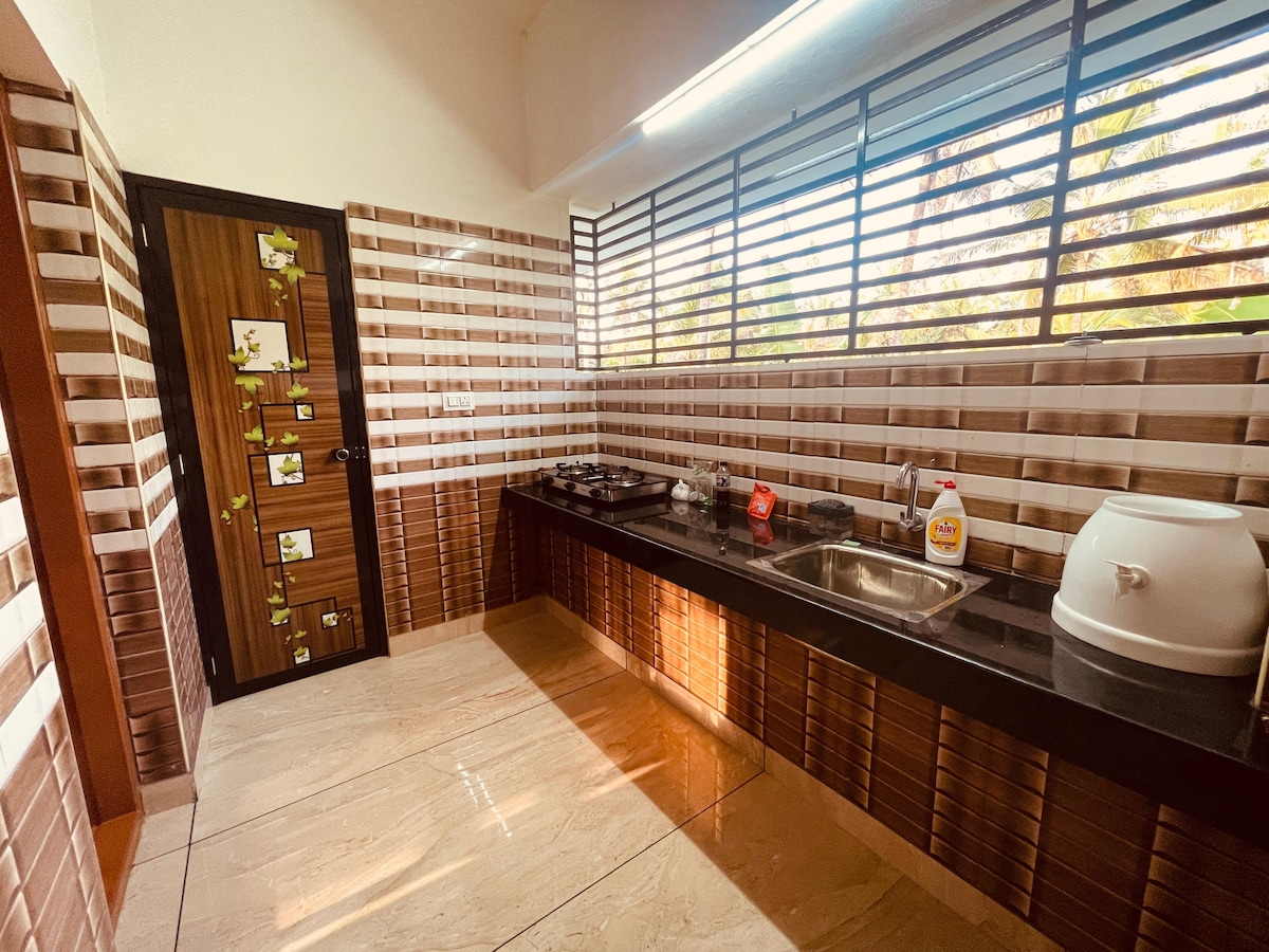 Te damos la bienvenida a nuestra espaciosa casa de familia 3BHK en el último piso en Pallikunnu, Kannur, a pocos pasos del famoso Templo Mookambika. Perfecto para familias, invitados a bodas y visitantes del templo, cuenta con 3 dormitorios adjuntos, un gran salón, cocina y balcón con vistas a la naturaleza. Disfruta de estacionamiento, agua las 24 horas, los 7 días de la semana, circuito cerrado de televisión, wifi y una estadía apta para mascotas. A poca distancia de templos, cerca de hospitales, escuelas y salas de bodas. Alquiler diario: siéntete como en casa y crea recuerdos duraderos con tus seres queridos.