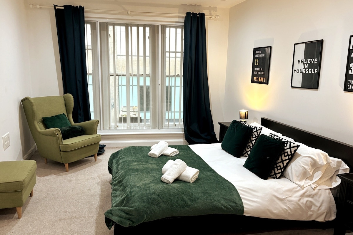 Un apartamento tranquilo, hermoso y espacioso con techos altos, estacionamiento y vistas increíbles desde el balcón. El departamento también ofrece un televisor grande de 55", colchones de muelles y una mesa de hockey de aire/piscina. ¡Tienes todo el apartamento para ti! Tiene capacidad para 4 personas en 1 cama tamaño king y 1 cama doble. También hay un pequeño sofá y sillón reclinable. Excelente ubicación, a 10 minutos de la bahía de Cardiff, el centro de la ciudad, el estadio Principality y el centro de actividades Whitewater, el centro Millenium y más.