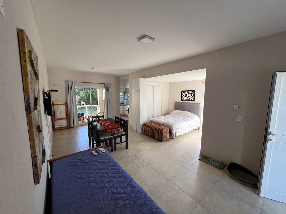 Duplex moderno remodelado en 2023, rodeado de verde y a tan solo 100 metros de la playa. En planta baja living con sillón y TV, toilette, comedor y cocina integrada totalmente equipada con vajilla y electrodomésticos, patio privado con living de exterior. En planta alta 1 habitación principal, baño completo y habitación secundaria con 3 camas simples. Condominio cerrado con amplio parque, wifi por fibra óptica, cocheras privadas y espacios comunes de parrilla y quincho.