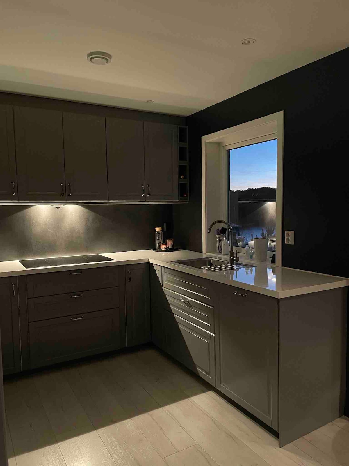 Una pequeña casa de madera única, idílica y de estilo moderno. La paleta de colores en esta cabaña está en tonos cálidos y envolventes. Los muebles de cuero sólido y los detalles interiores antiguos crean un efecto rústico acogedor. Los techos y ventanas negros enmarcan la vista y los colores de la naturaleza en el exterior. Aquí cae la luz desde la gran ventana sobre el mostrador alto de la cocina y puedes sentarte y disfrutar de la vista del bosque y el fiordo.