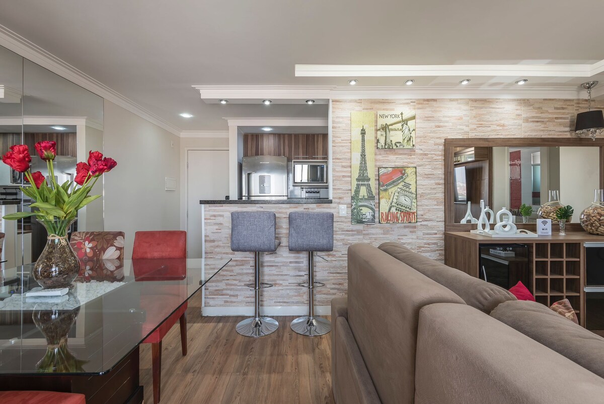 Estudio moderno, lujoso , de 47 m², ubicado en un condominio residencial en la calle Duque de Caxias 880, a pocos pasos de Cambuí. Cerca de bares, restaurantes, supermercados, cafés y más. Hermosamente decorado y equipado, cama tamaño queen, armario, agua caliente en todos los grifos, cafetería Nespresso, 2 aires acondicionados, TV giratoria de 50pulgadas (acceso desde la habitación y el dormitorio), ducha con inodoro y estación de trabajo para dos personas. Condominio con un ocio increíble.