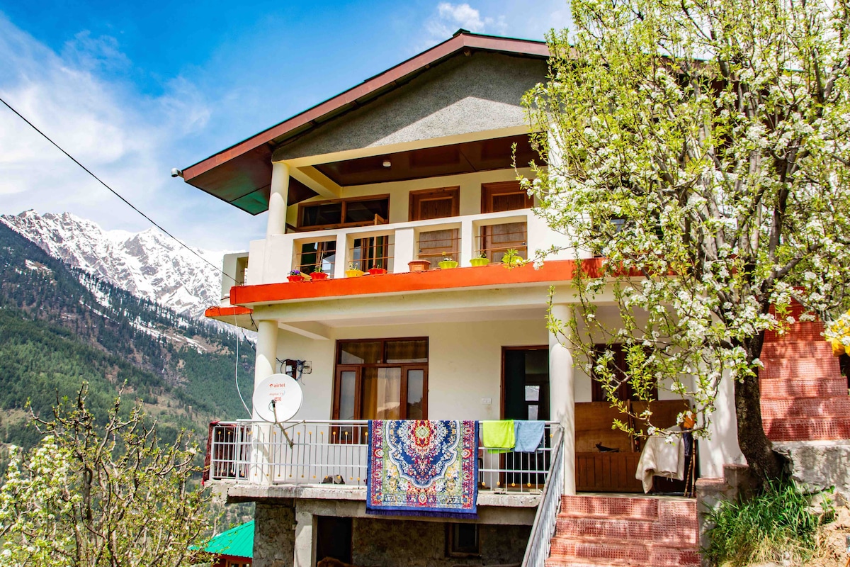 AIRCRIB | Habitación privada y balcón | Old Manali 🏔️ LO más destacable: ★🌄 Vistas desde el balcón a las montañas Vashisth, la cascada Jogini y los huertos de manzanos ★📍 A 2 minutos a pie de Dragon Chowk, a 10 minutos en auto de la parada de autobuses de Manali ★ 📶 Wifi de alta velocidad ★ 📺 Android TV con una caja de películas que ofrece más de 1000 películas ★ 🍽️ Comida casera disponible ★ 🧺 Servicio de lavandería disponible ★ 💧 Agua potable RO ★ 🔥 Calefactor disponible por 300 ₹/noche ★ 🚗 Estacionamiento en el lugar (actualmente no disponible debido a la nieve ❄️)