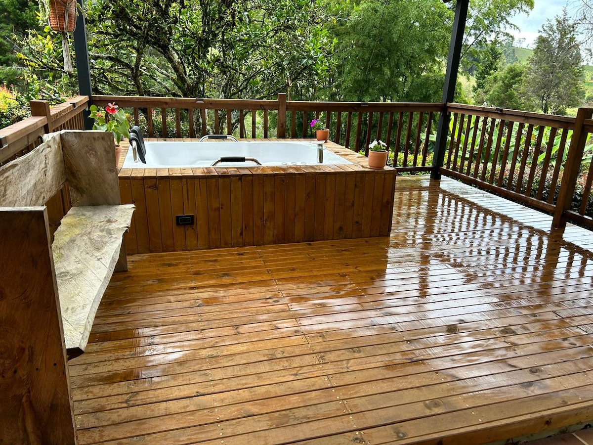 Hermoso lugar con vista al bosque y al valle. Cocina equipada para 4 Personas. Zona de terraza con BBQ. Jacuzzi en terraza totalmente cubierto. Video proyector para entretenimiento Terraza con vista panoramica. Estacionamiento Privado Camas comodas, Espacio de trabajo, zona de Tv. Baño con agua caliente constante, ofrecemos articulos basicos como jabon, papel higienico, toallas, etc.