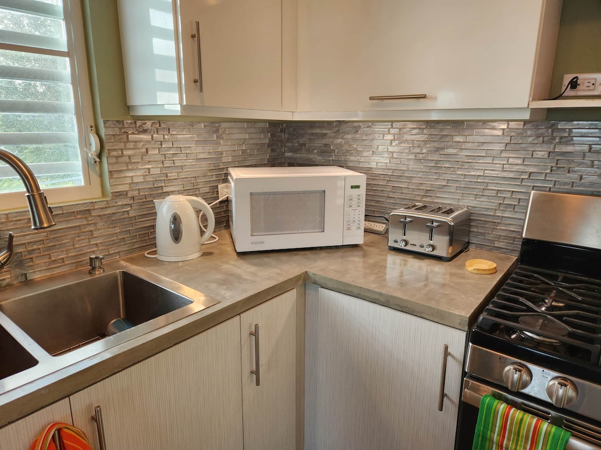 The perfect place to unwind and enjoy the outdoors. Designed with a modern touch, it features a fully equipped kitchen, full bathroom, outdoor shower, and accommodates up to 3 guests. Relax in the beautiful plunge pool, enjoy a barbecue on the terrace, and fall asleep to the soothing sounds of the coquí frogs, surrounded by lush tropical greenery. Sweet and friendly little cats may occasionally stroll through the outdoor areas, adding to the natural charm and warm ambiance of the property.