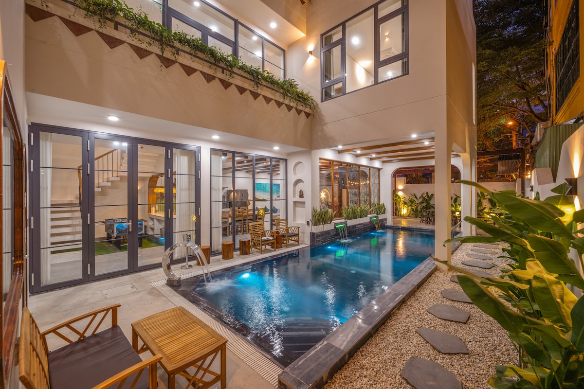 Escondida en el corazón de H ! i An, en el centro de Vietnam, esta serena villa de 5 dormitorios es tu escapada privada en medio de interminables campos de arroz, donde pastan búfalos de agua y bandadas de aves blancas que pasan volando . A solo 2 km de la ciudad antigua de H ! i An y de la playa de An Bang, ofrece vidrio del suelo al techo, interiores de madera natural, piscina privada y vida de planta abierta. Un refugio perfecto para retiros conmovedores, reuniones alegres o celebraciones significativas, donde cada amanecer se siente como una bendición.
