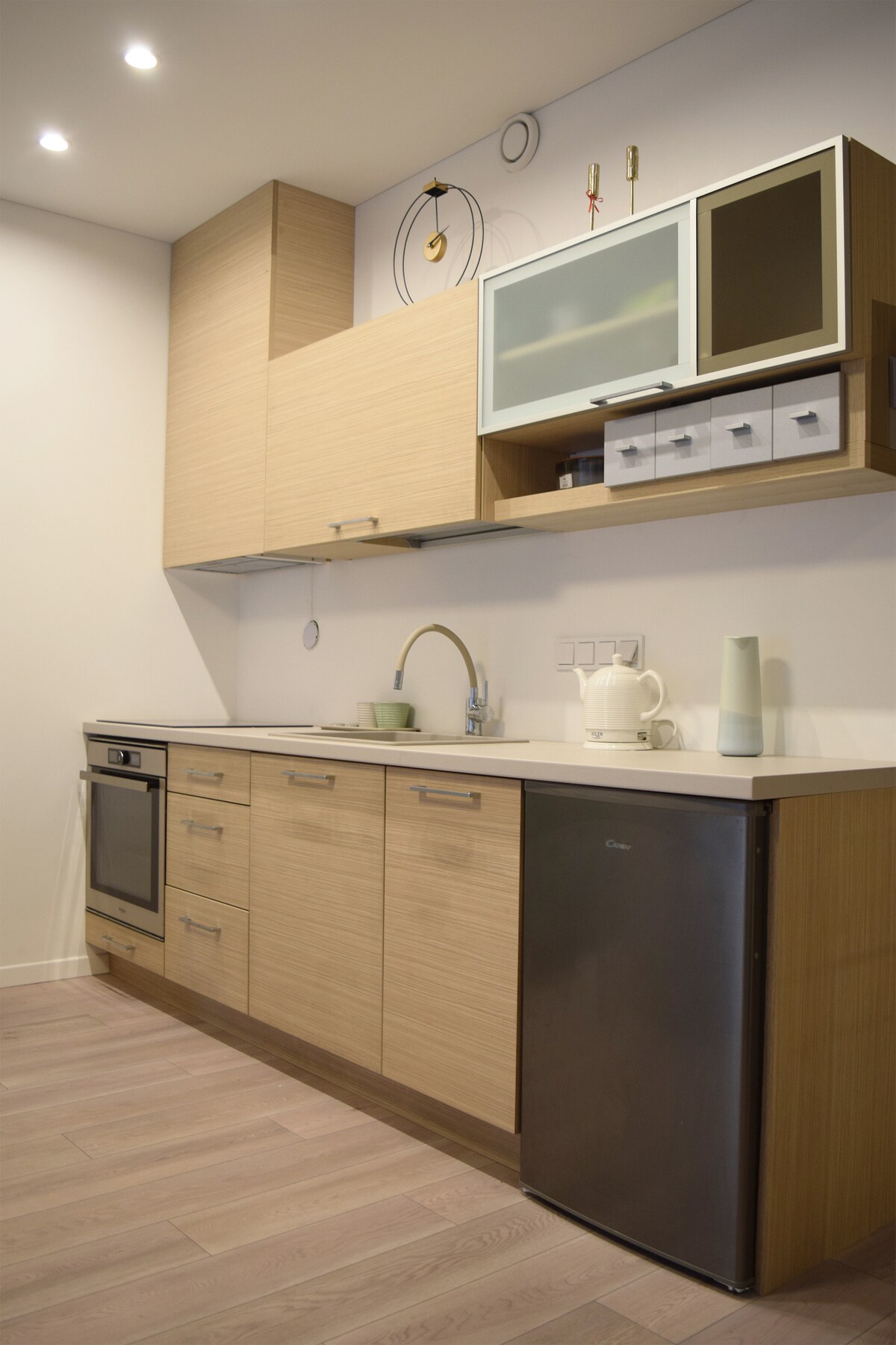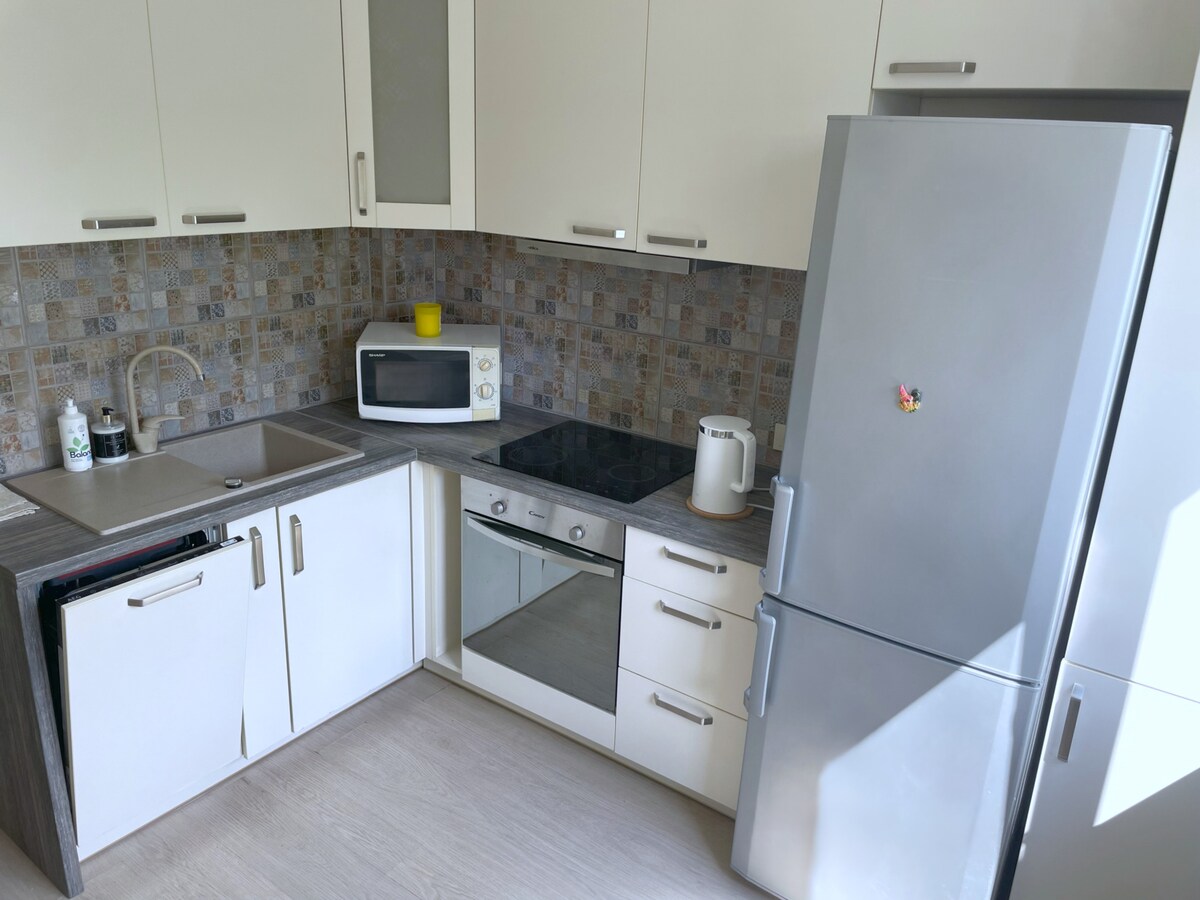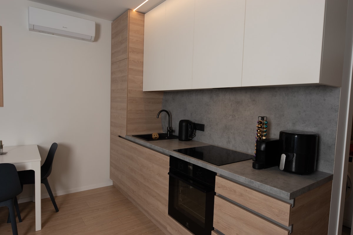 Un moderno departamento de una habitación de 70 m2 con todas las comodidades a pocos pasos del casco antiguo de Vilna. Amplia sala de estar con cocina abierta totalmente equipada, baño con ducha y bañera grande, dormitorio con persianas de madera para la oscuridad, sistema de sonido para noches románticas con vino.