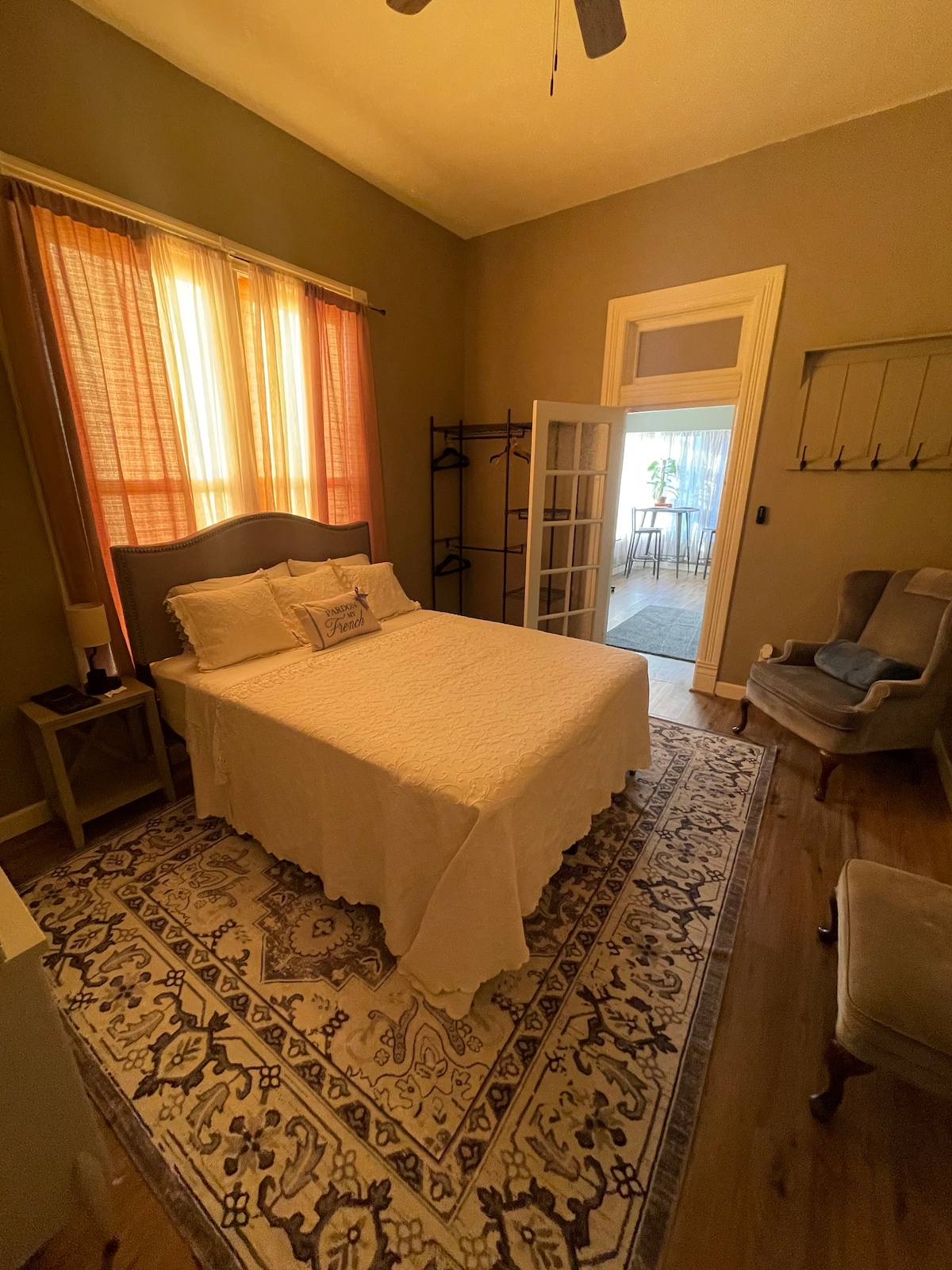 Manténlo simple en este tranquilo y céntrico apartamento de 1 dormitorio. A poca distancia a pie del centro de Main Street, a 2 millas en coche de todas las tiendas y restaurantes, cerca del transporte público y a poca distancia en coche del Parque Nacional Sequoia. Ven a disfrutar de esta nueva restauración de un monumento de 125 años en el centro de Porterville con comodidades modernas que no te distraerán del carácter original y el porche delantero privado orientado al este para disfrutar de tu café.