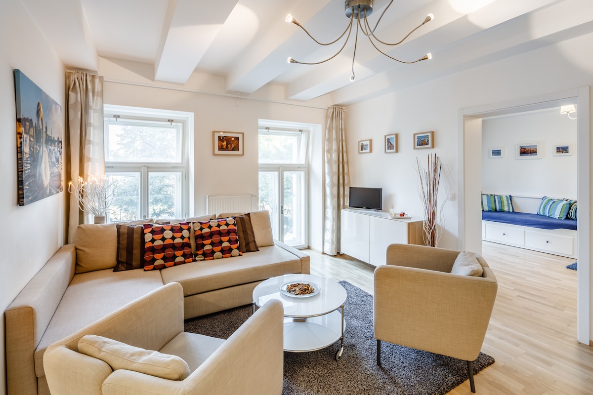 Disfruta de tu estancia en mi hermosa casa de estilo Art Nouveau construida durante la década de 1890, pero con todas las comodidades modernas que uno podría desear. Apartamento de dos dormitorios cuidadosamente renovado con amplias habitaciones con techos históricamente altos decorados con molduras de estuco ornamentadas, camas tamaño queen, internet de alta velocidad y una gran y espaciosa ducha de efecto lluvia. El lugar ideal para sentirse como en casa mientras estás en Praga, ya sea para un fin de semana largo, un viaje de negocios o, por qué no, una larga estancia. ¡Deja que mis reseñas hablen por sí mismas!