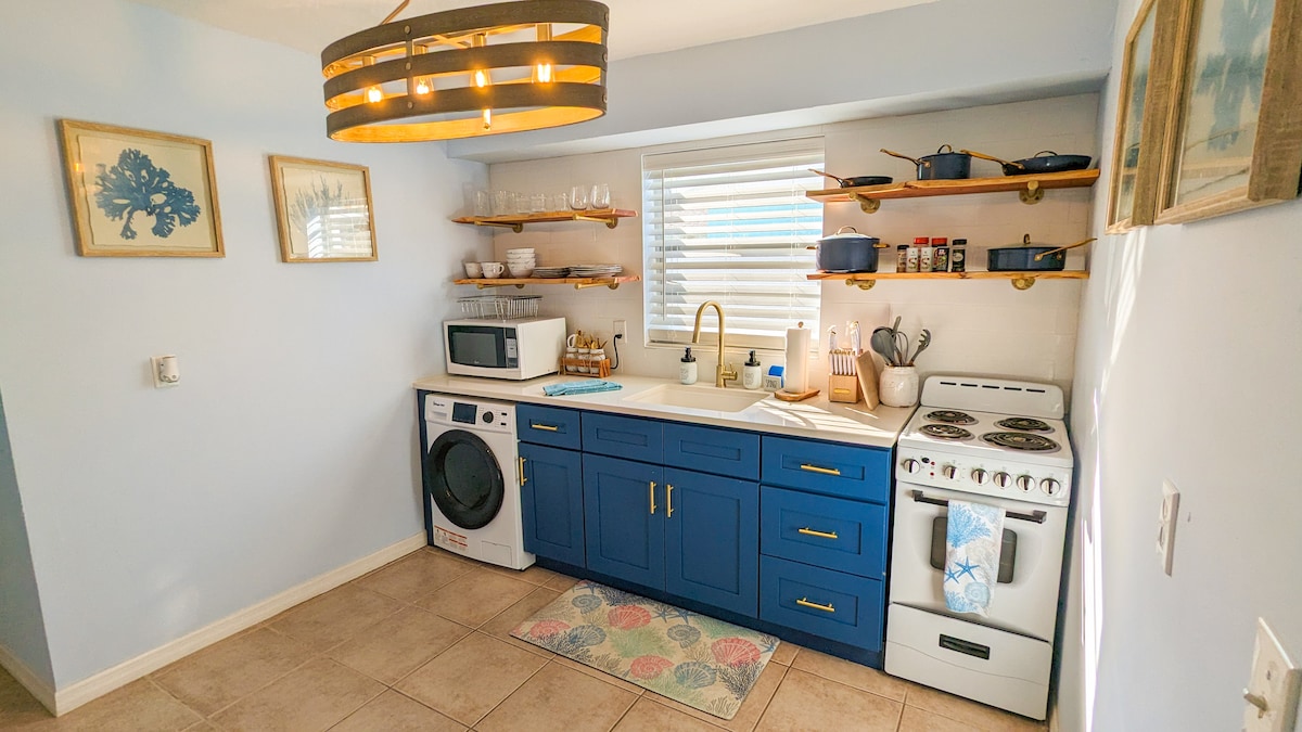 ¡Hay un montón de estacionamiento para un remolque para la Semana de la Bicicleta! Estamos ABIERTOS a aceptar mascotas, pero envía un mensaje antes de reservar para discutirlo. ¡El patio delantero ha sido completamente remodelado con un montón de mejoras! Bungalow totalmente abastecido de los años 50, TV de 75pulgadas con muchas opciones de streaming y, lo más importante, a 1 cuadra de la playa en el corazón de Daytona Beach Shores. Sal por la puerta principal y estarás a 100 yardas del borde del agua y a 3 minutos a pie de tu Starbucks local. No hay nada mejor que esto.