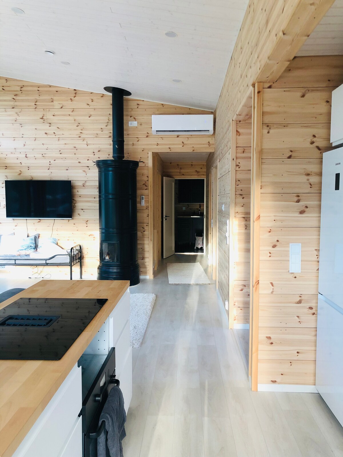 Apartamento acogedor y limpio con entrada privada. Cocina totalmente equipada. Se puede calentar la sauna a diario, refrescarse en la terraza protegida, hacer barbacoas (a gas) y hay una chimenea. Camas hechas en los dormitorios (160 cm, 120 cm). Sofá cama en el salón (140 cm). Camas de viaje para niños pequeños. Se admiten mascotas (recuerde informar al hacer la reserva). La ropa de cama, las toallas y la limpieza final están incluidas en el precio. El apartamento está a unos tres kilómetros del centro de Kajaani en dirección al aeropuerto.
