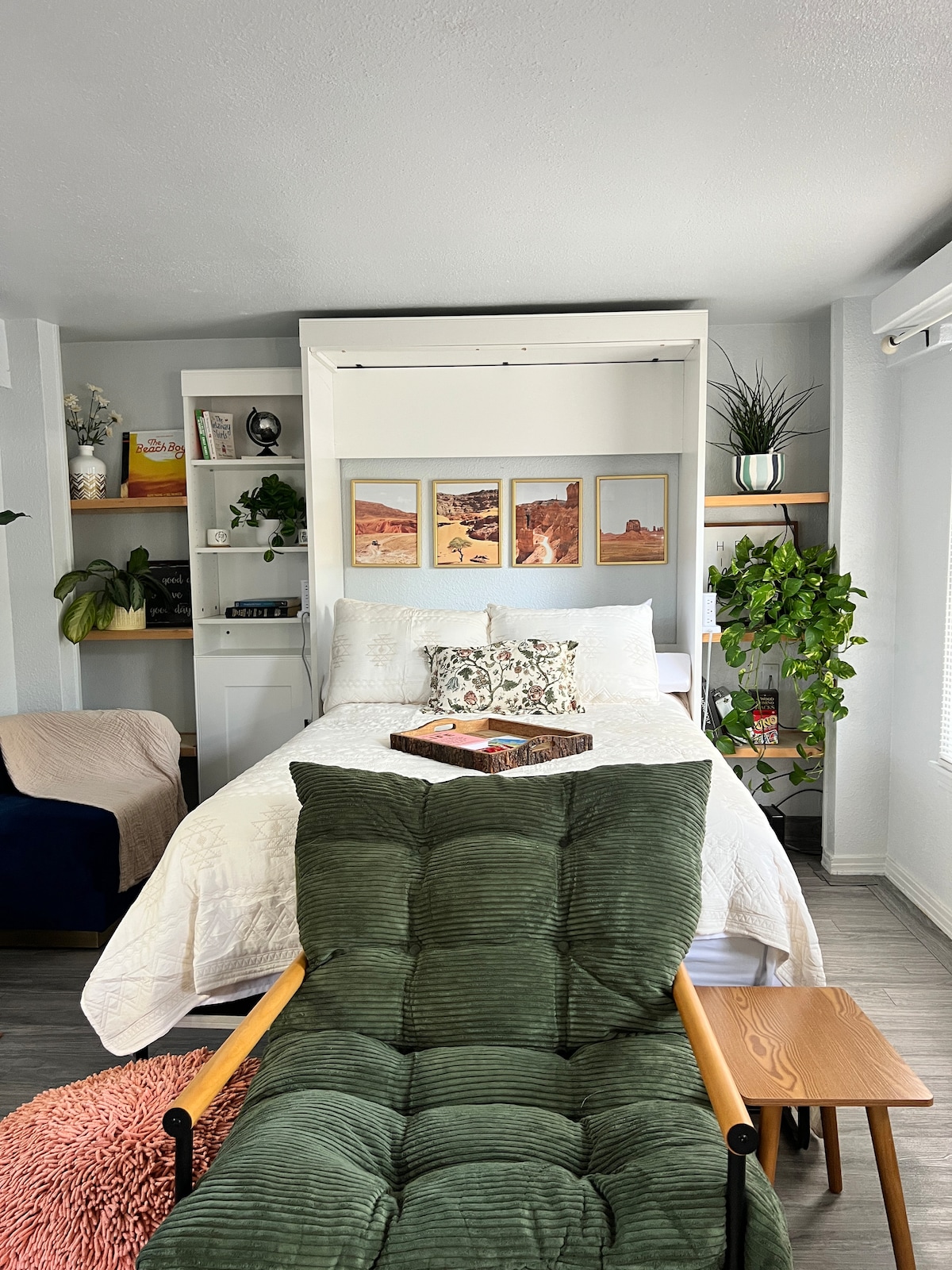 With the attractive Dutch architectural lines and Santa Fe-style stucco exterior, wood trimmed interior, 10’ ceilings and custom made furniture, you’ll hardly believe you’re in a tiny house. One master bedroom with a king-size bed, a queen size sleeper sofa and a comfortable floor mattress allows up to six guests to sleep here. Full-size bathtub and luxurious walk-in shower, along with a kitchenette, dining room and more make this your perfect “home away from home.”