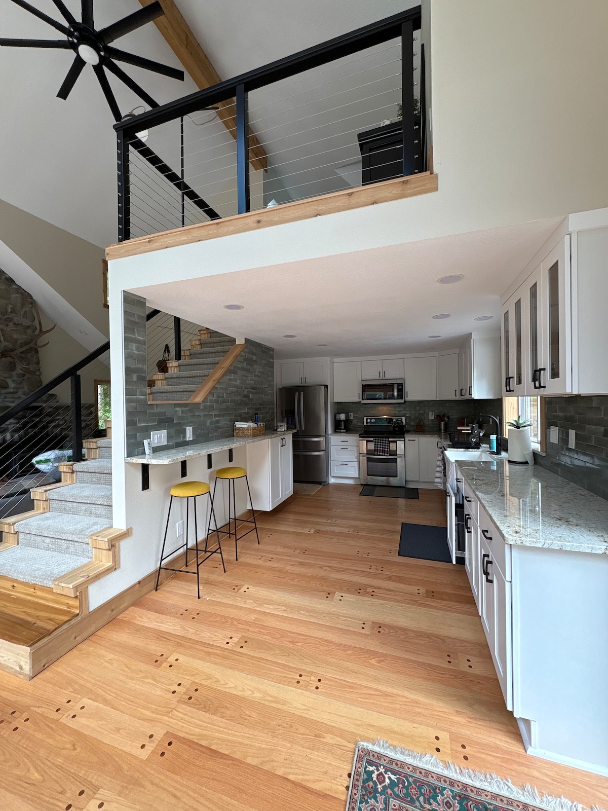 Bienvenido a nuestra impresionante cabaña arqueada de dos dormitorios y dos baños ubicada a lo largo del río Sandy. Disfruta de acceso directo al río, donde podrás disfrutar de la belleza natural de los alrededores y de las vistas al monte Hood. La sala de estar de concepto abierto cuenta con grandes ventanales que enmarcan las impresionantes vistas del río, creando un ambiente acogedor que es perfecto para relajarse. Disfruta de una sauna de barril con vistas panorámicas al río. La cabaña está cerca de un sinfín de actividades en el monte Hood y sus alrededores.