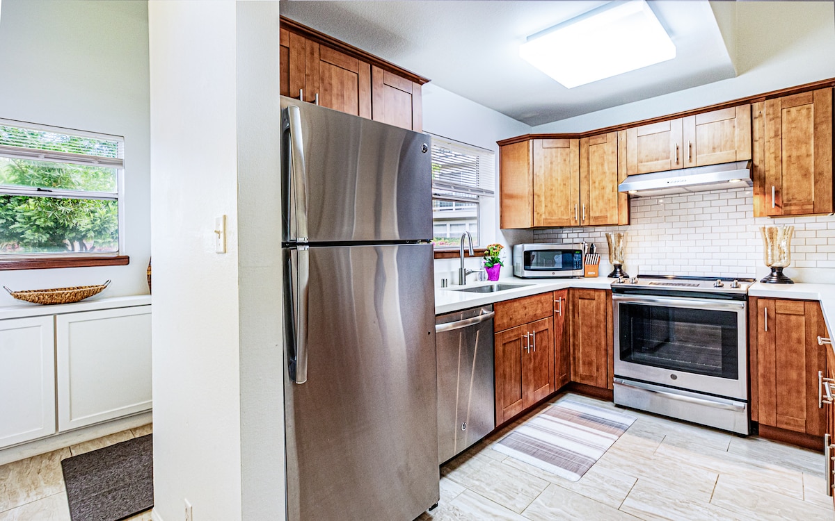 ¡Escápate a tu elegante apartamento de Big Island en Waikoloa Village! Esta suite contemporánea totalmente renovada de 2 dormitorios/2 baños con aire acondicionado tiene capacidad para 6 personas. Disfruta de un lanai privado, entrada sin llave, cocina totalmente surtida y acceso a una piscina compartida y jacuzzi. Ubicado en el centro, estás a pocos minutos de las mejores playas, un supermercado y un campo de golf. Perfecto para familias o grupos que buscan una base de operaciones tropical para explorar la isla.