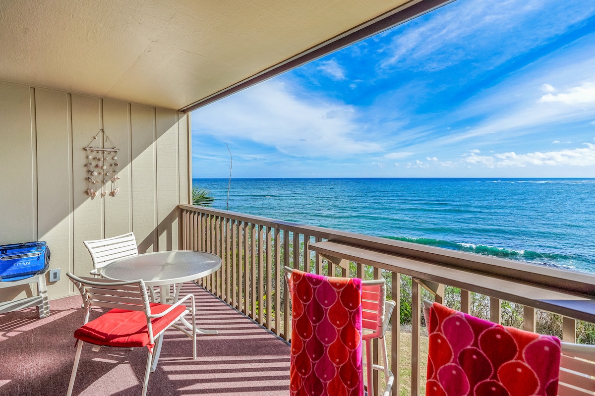 Enjoy the sound of crashing ocean waves, a gentle sea breeze & grand ocean view from your OCEANFRONT STUDIO CONDO. Watch whale breaching during winter season from your secluded balcony. One of the only remodeled units, with larger kitchen, luxury bathroom w/double vanity. Best location between the North & South shore. Close to restaurants, bars, grocery, attractions. 7 miles away from the LIH Airport. A/C, ocean-front pool, hot-tub & cabanas. No daily resort fees, free parking/beach gear.
