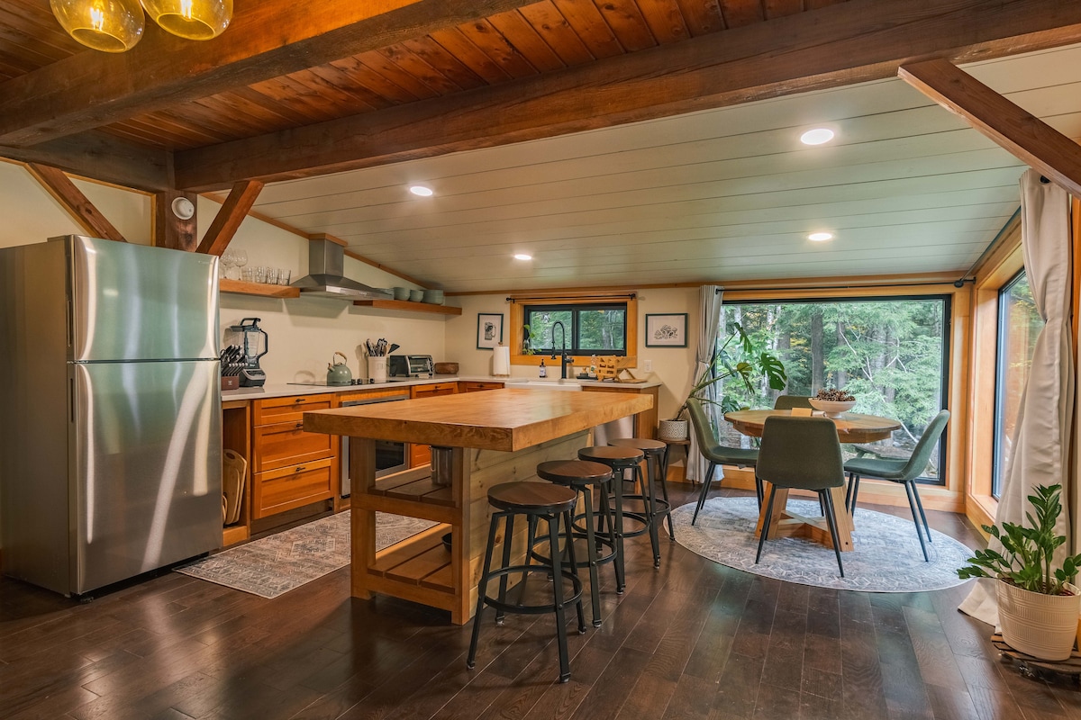 Cabaña hogareña y tranquila, pero grande. Todas las comodidades modernas. No verás a nadie. Wifi, sauna, nueva bañera de hidromasaje para 6 personas 2025, 2 terrazas... mucho espacio. Estufa de leña con frente de vidrio. Lavadora/secadora comercial. Cocina grande del nuevo chef con lavavajillas Bosch (tranquilo) y cocina de 5 fogones, horno de vapor/convección y microondas en el cajón afilado en 2024. Escritorio y silla de oficina. Fogata al aire libre con parrilla ajustable. Cama king agregada el 25 de julio. Ropa de cama cómoda. Aislado, tranquilo pero accesible.
