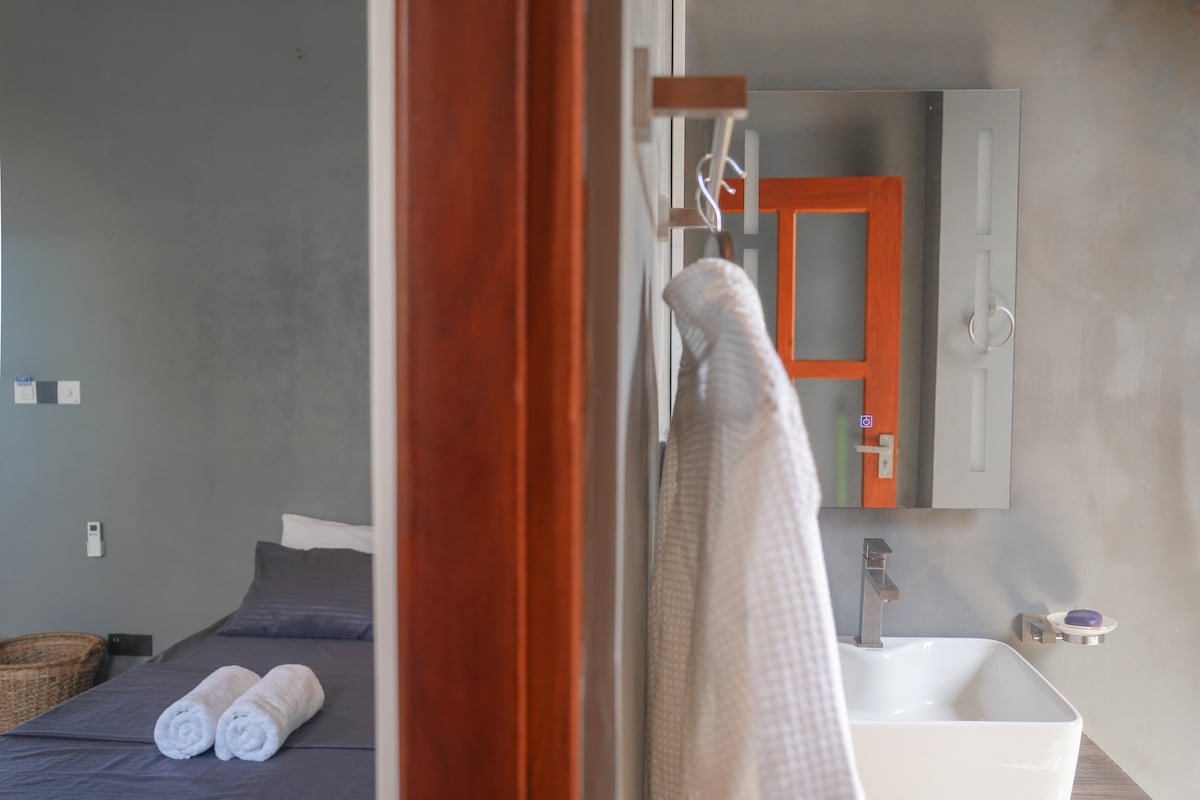Genial y minimalista, es Paolo 's Cottage, ubicada en el exuberante jardín ecológico de Deep Blue Homestay Rental. La última adición a la casa de familia en Deep Blue, la cabaña está en el segundo piso con terraza, cocina, esquina, baño, dormitorio y sala de estar. Desayunos servidos bajo pedido 5 dólares por persona