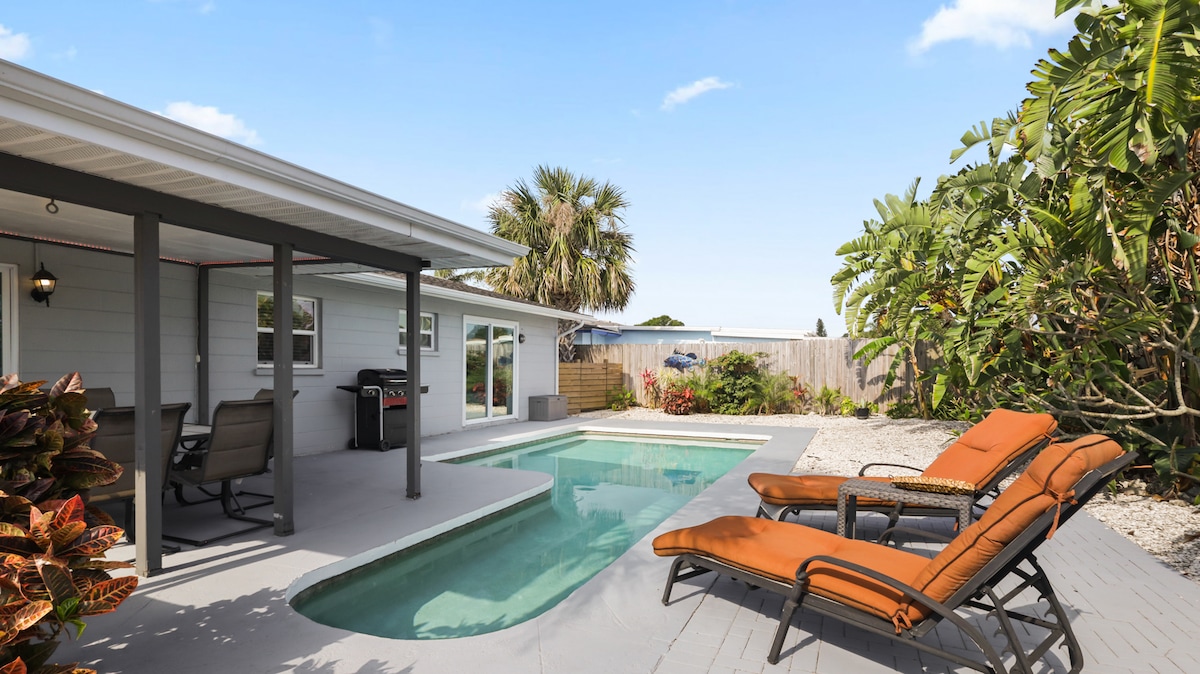 Cozy tropical retreat just 4.6 miles from Sarasota Airport and 7 miles from the beach. Perfect for two! Enjoy a private stock tank pool, fully equipped kitchen, comfy bed, fast Wi-Fi, and free parking. Relax in your own peaceful outdoor space and feel the tropical vibe. Ideal for a romantic escape, a beach weekend, or simply to unwind in a unique and private setting.