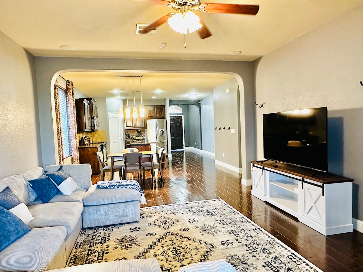 Nuevo lujo 3BR/2BT ubicado en una parte serena de Odessa. Amplias habitaciones con TV de 85 pulgadas en LR y TV de 65 pulgadas en Master BR. Camas/muebles modernos con puntos de carga de teléfono y computadora portátil. Tiene un espacio de trabajo dedicado y modernos escritorios de oficina con alturas eléctricas ajustables. Amplio patio trasero con césped limpio, parrilla para barbacoa y juego de muebles de exterior y patio