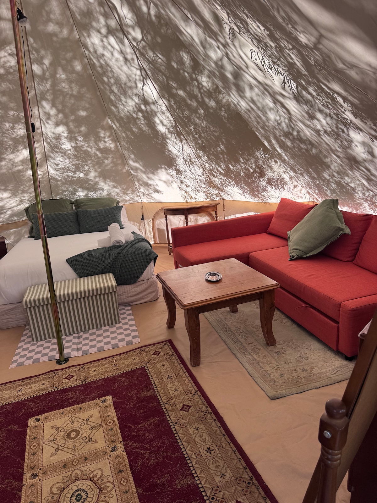 "Tienda de campaña cómoda" Una nueva forma de acampar. Para aquellos que quieren la experiencia de acampar pero que quieran disfrutar de las comodidades de su hogar. No se puede estacionar todo el equipo, configurarlo, empacar. Solo tienes que llegar y tenerlo todo listo y te estoy esperando. Pasa todo el tiempo relajándote en lugar de trabajar. Nuestra tienda de campaña de confort tiene calentador, manta eléctrica, ropa de cama de lujo, sofá salón, hervidor de agua y nevera. También te proporcionamos té, café y azúcar. No hay necesidad de la gran 4x4 llena de equipo, todo está aquí para ti. ¡Solo trae vino!
