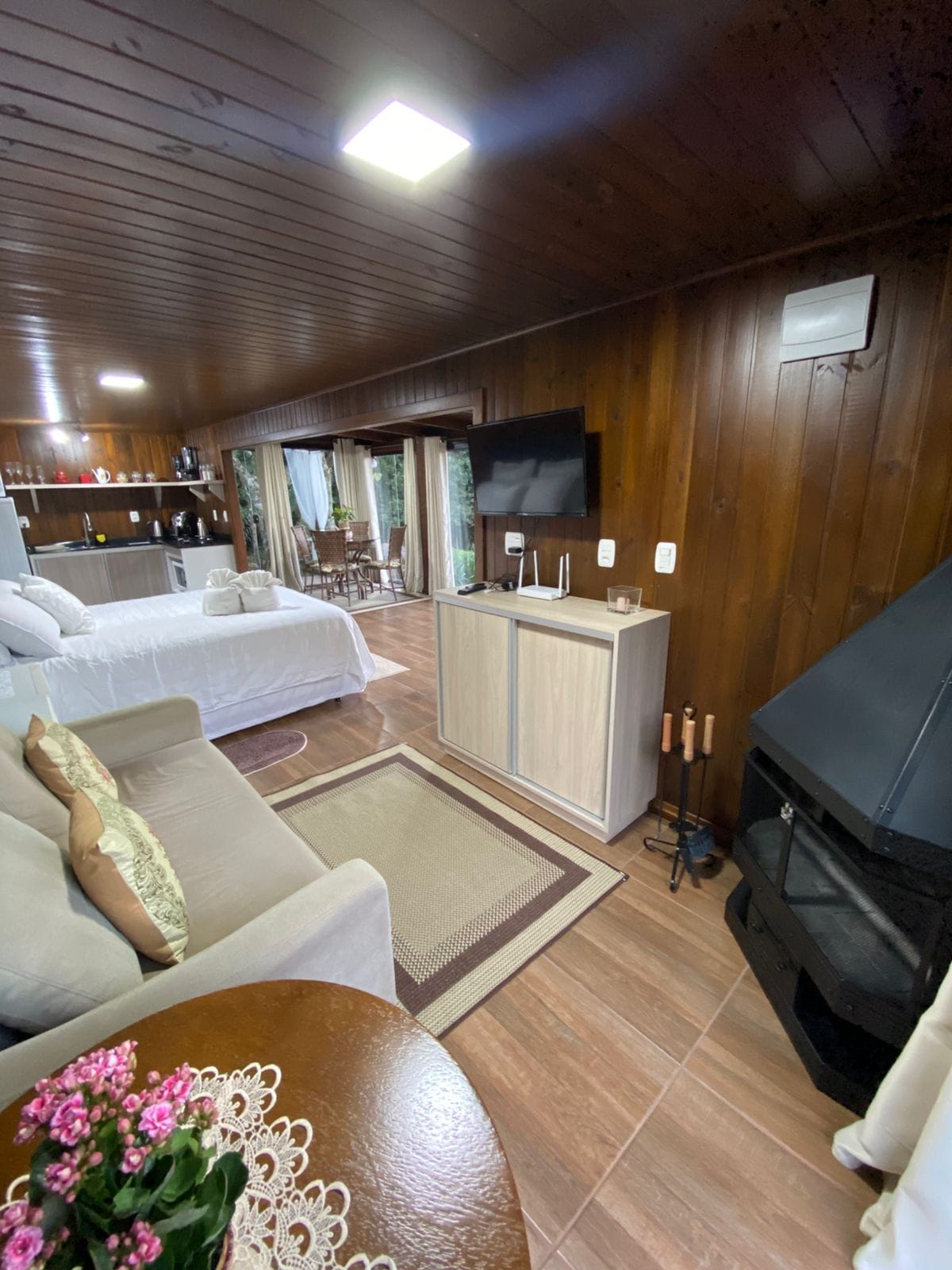 Acogedora cabaña ideal para quienes buscan tranquilidad y contacto con la naturaleza, pero sin renunciar a la comodidad. Combina lo rústico con lo sofisticado, con muebles exclusivos hechos de madera durante la construcción, pero también con bañera de hidromasaje y ducha de gas, cama queen, aire acondicionado, wifi y cocina. Un alojamiento de lujo en medio de la naturaleza. Se encuentra en la cima de la colina Zuckerhut, en la localidad de Ano Bom, en Colinas/RS. Desde la terraza, se puede disfrutar de una vista increíble del valle y disfrutar de la puesta de sol.