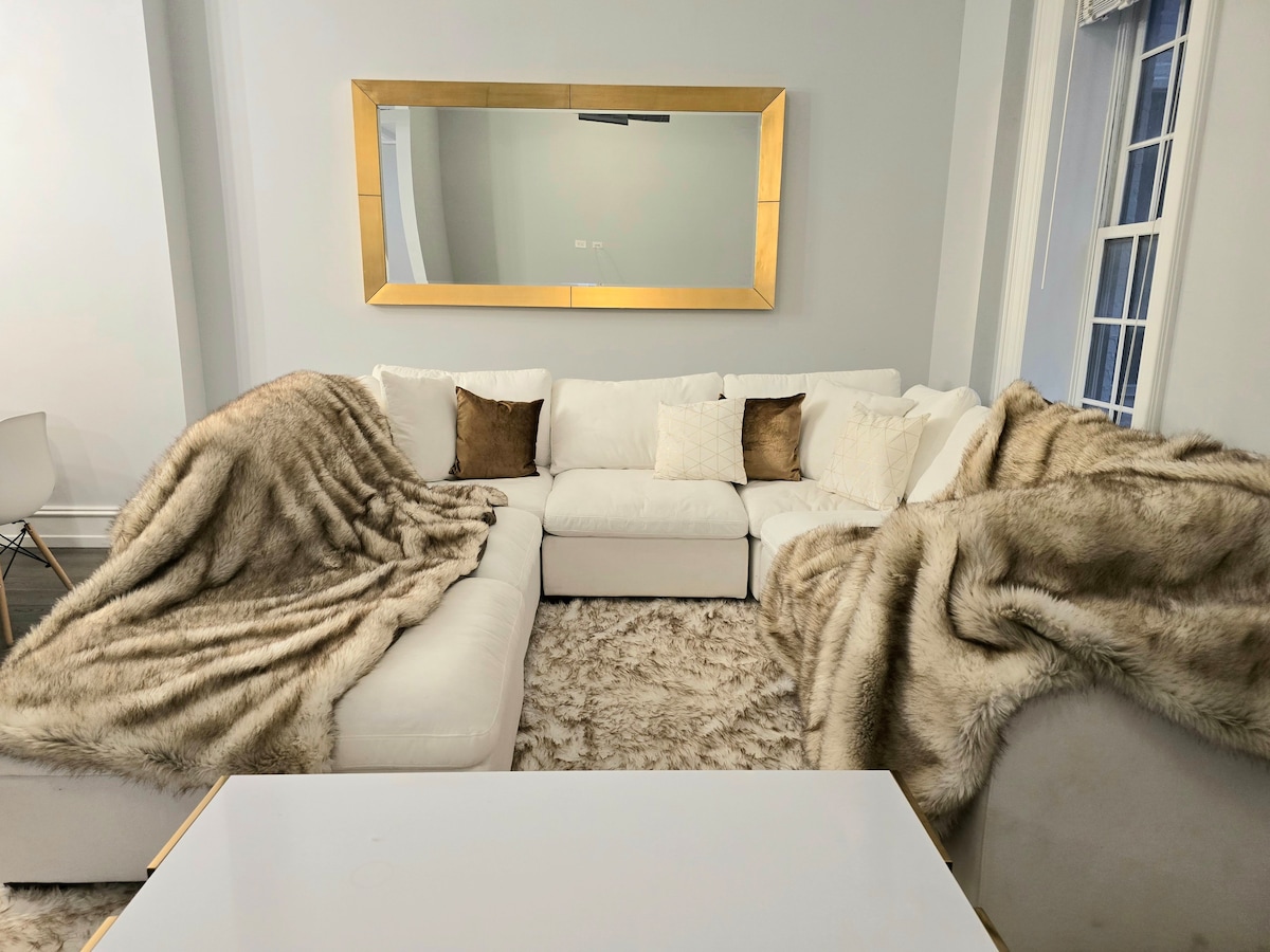 Apartamento gigante de 4 dormitorios y 2300 pies cuadrados en el segundo piso, cerca de la línea roja de tren, bares, cafeterías, tiendas, restaurantes, el lago y todo lo demás que Chicago tiene para ofrecer. Amplio salón con zona de bar, TV y nevera para socializar antes de salir a la ciudad. El comedor tiene una mesa grande y 8 sillas. 4 dormitorios con 2 habitaciones privadas con camas tamaño king y una con cama doble. 4 futones en la sala de estar para espacio adicional para dormir. Dos (2) plazas de aparcamiento en el garaje orientado al oeste en las instalaciones.