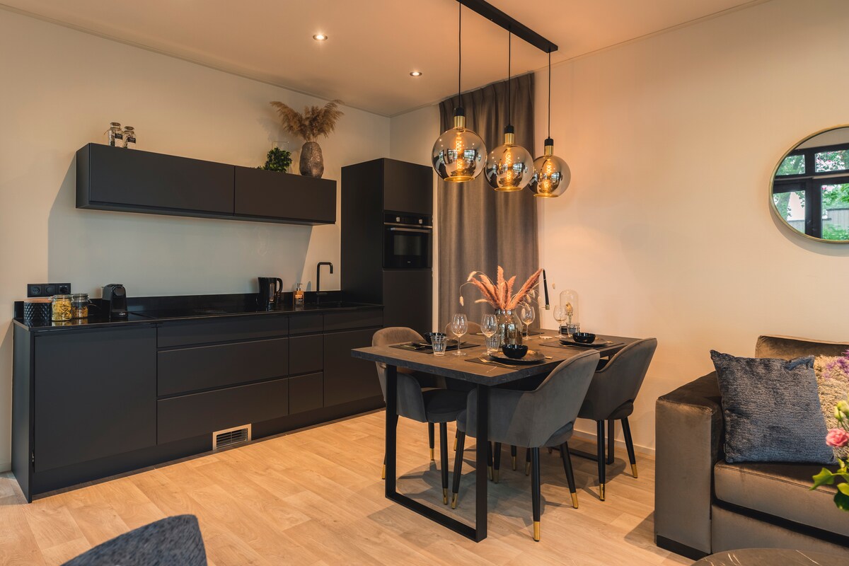 Alojamiento tranquilo y céntrico junto al bosque con una gran bañera, ducha de efecto lluvia y sauna privada. TV grande, cocina abierta, cama de hotel, jardín privado. Ubicación libre.