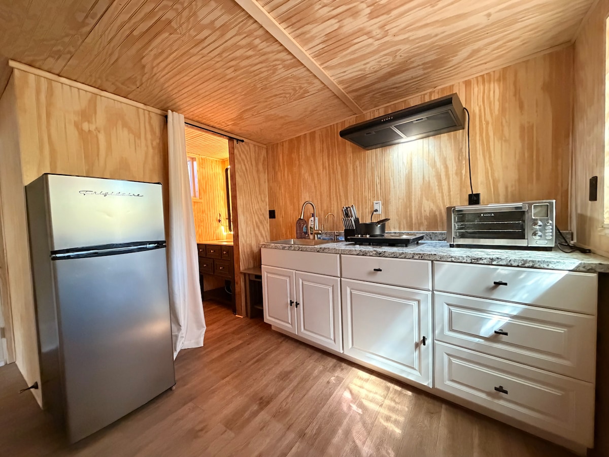 Empecé a crear esta minicasa en 2017, impulsado por mi pasión por el movimiento de las minicasas. Es una estructura separada de la casa principal, que combina elementos nuevos, antiguos, recuperados y modernos. La casa pequeña cuenta con puertas francesas que conducen a una terraza privada, perfecta para disfrutar del aire libre. La cocina está totalmente equipada con todo lo que necesitas, incluyendo: - Refrigerador de tamaño completo - Microondas. - Horno tostador - Hornillo eléctrico - Wok eléctrico - Cafetera (con cápsulas K-cups) - Ollas, sartenes y utensilios