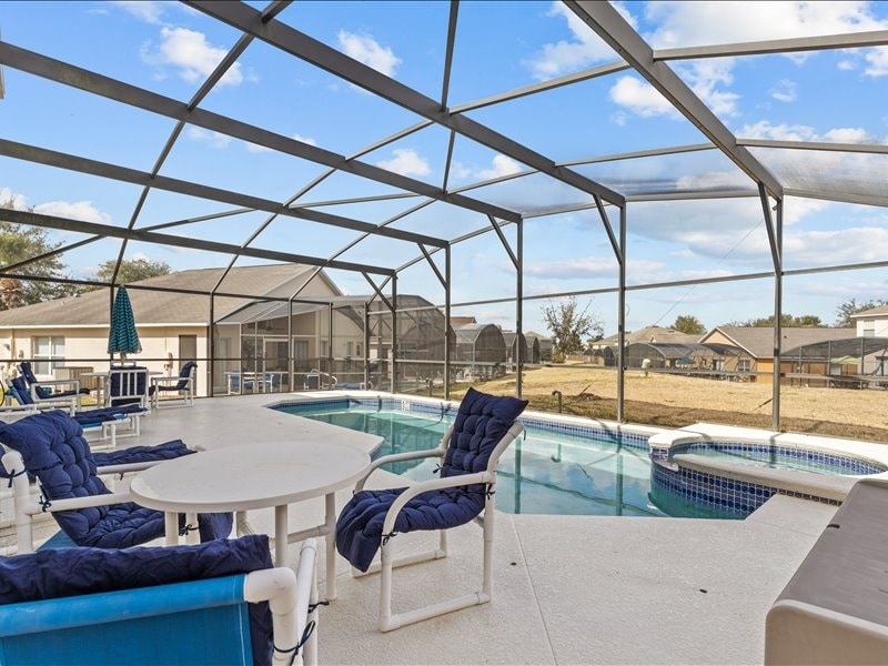 Hermosa casa de estilo Monterey de 1600 pies cuadrados, 2 dormitorios/2 baños, totalmente amueblada con una piscina climatizada a 85' todo el año. Excelente ubicación en Río Grande, a solo un corto paseo en carrito de golf de Spanish Springs y Lake Sumter. La casa está en un callejón sin salida tranquilo; sin vecinos detrás. Lanai privado desde la sala de Florida. Encimeras de azulejos y granito en todas partes; electrodomésticos de acero inoxidable; sofá cama en el salón. Carrito de golf de gasolina para 4 personas también incluido. Lo sentimos, jacuzzi no incluido. ¡Se admiten perros! Televisores inteligentes en ambos dormitorios, cable solo en el salón.