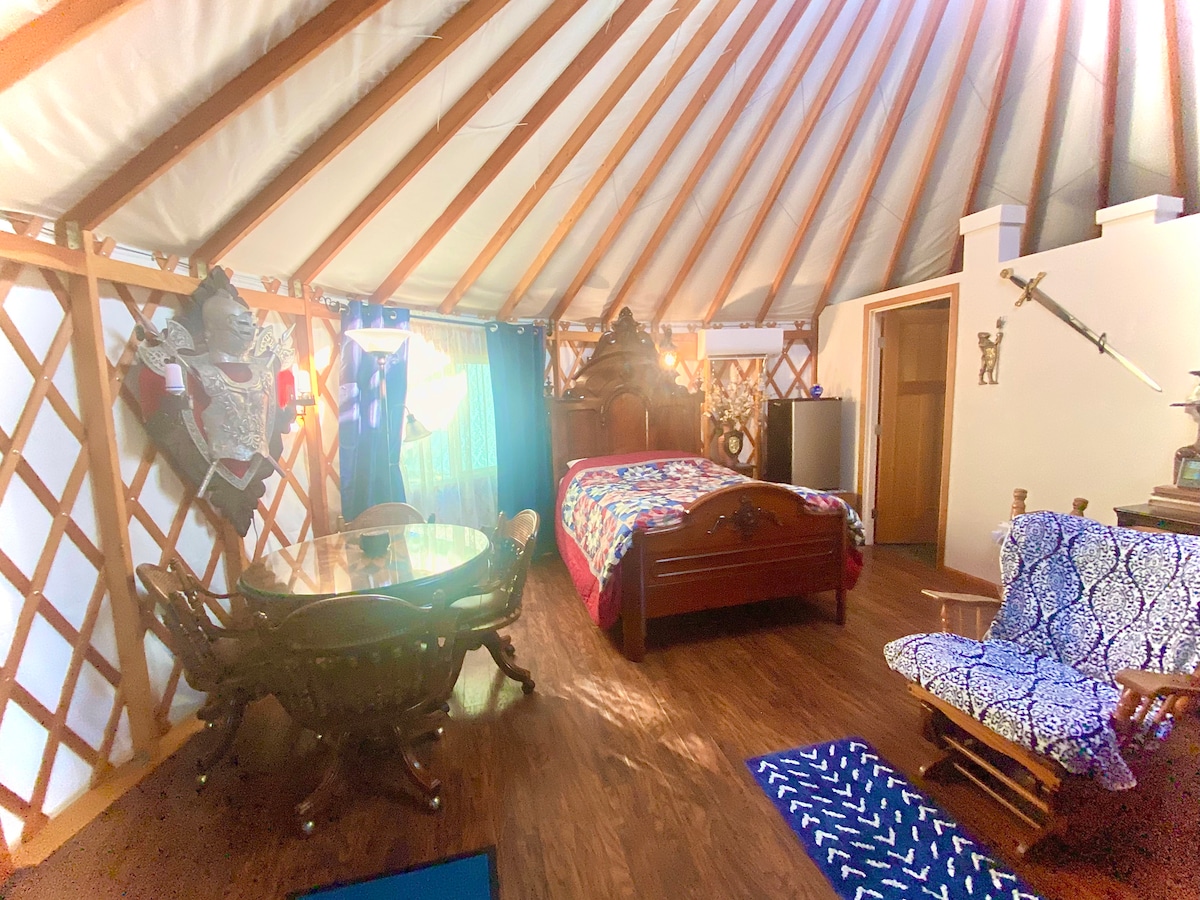 Esta es una yurta temática de la época medieval. Su exterior es de un verde azulado y tiene 24 pies de diámetro. Mi casa es ideal para vacaciones, aventureros y viajeros de negocios. Se pueden ver las estrellas desde el tragaluz. Es una de las 3 yurtas de Yurtel-Veneta. Su propia bomba de calor mantiene el interior fresco o en cálida comodidad. Una vez que te has quedado en una redonda, el resto de alojamientos son simplemente cuadrados. Disfruta de una selección de café y artículos de desayuno de autoservicio de cortesía. Cerca de excelentes bodegas.