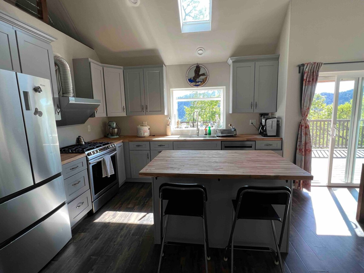 Spectacular private views/deck/pool/hot tub! Fast WiFi. Available for medium term! Fenced acres secure for pets. You will feel like you have your own valley with unspoiled 360 views of oak & evergreen forested mountains. Large custom, modern design home w/ 4 bed/3 baths, open 2 story family room w chef's kitchen and large windows, off grid, stays cool. Your private stunning 50 acres! Hot tub, pool table, horseshoes, tire swing, kids zipline, dine/relax and dine and grill on large viewed deck