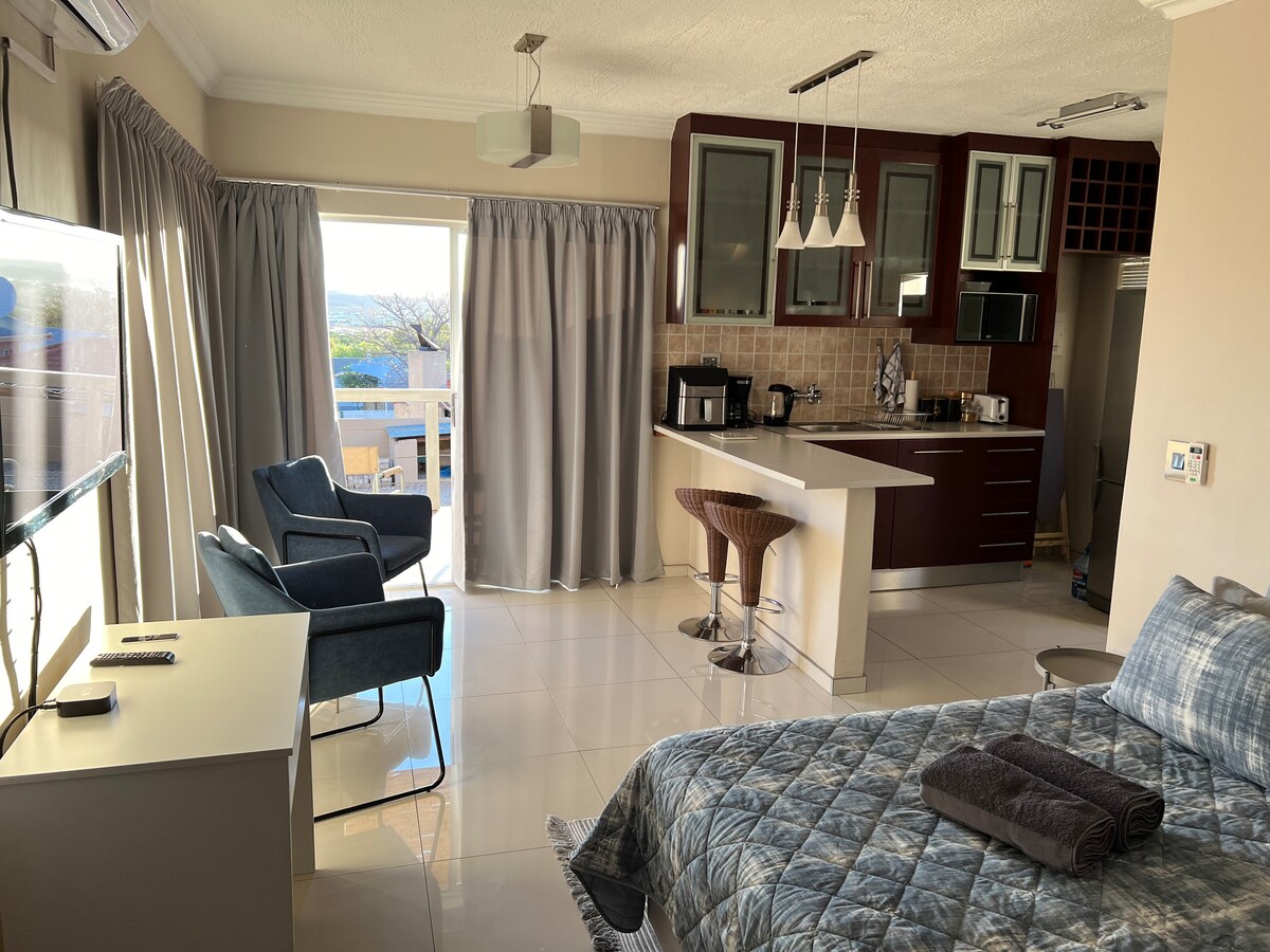 Elegante apartamento urbano para el viajero moderno. Estás en el corazón de Windhoek, pero muy privado, con unas vistas impresionantes de la puesta de sol desde el cuarto piso. Duerme en una cama tamaño queen lujosamente equipada en una habitación con vistas. Disfruta de las puestas de sol en tu balcón privado. Disfruta de Netflix gratis o de cualquiera de tus programas favoritos en una pantalla plana de 75 pulgadas. Date un chapuzón en la minipiscina comunitaria o haz una barbacoa en la zona comunitaria de braai. Aparcamiento interior seguro. Buen wifi. Solo 1 vecino directo. Seguro y tranquilo.
