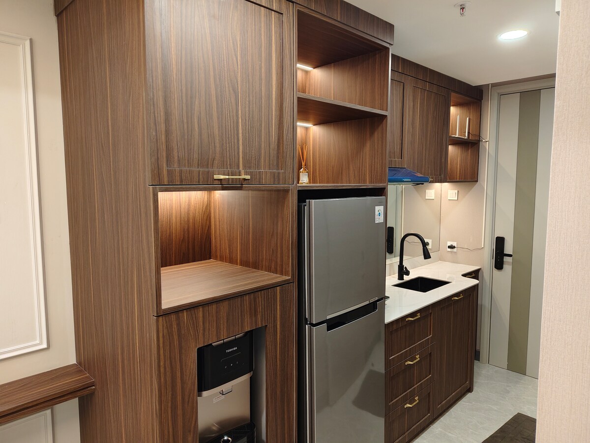 Apartamento tipo estudio con interiores de lujo, camas cómodas y de calidad, ubicación estratégica sobre el centro comercial en East Surabaya. Esta unidad tiene capacidad para un máximo de 3 adultos (con una cama supletoria de 100.000 rupias por noche, previa solicitud, informa con antelación). Vista a la ciudad con amplias ventanas. No hay balcón.