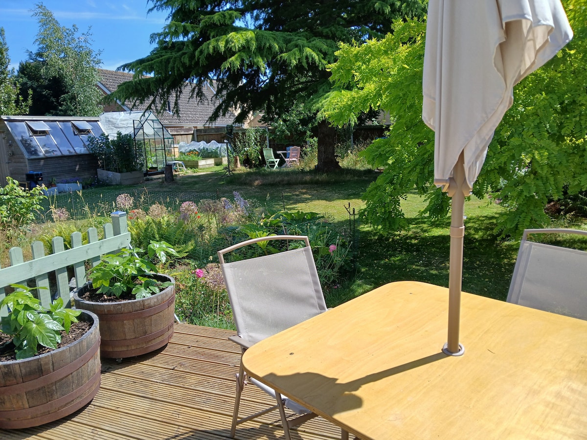 Estudio anexo que admite perros en Beccles (los perros no deben dejarse solos). Cama doble y sofá cama para viajeros solitarios, parejas y familias jóvenes (no apto para grupos). Construido en verano de 2023. Aparcamiento en la unidad, wifi y patio privado: escapada elegante y cómoda. 😊 A 10 minutos a pie del centro de la ciudad, a 3 minutos del pub local, a 15 minutos de la piscina exterior y del río Waveney y a solo 5 minutos del parque infantil, de la zona de ejercicios para perros y del campo. La playa más cercana está a 15 minutos en coche. ¡Excelente ubicación para explorar!