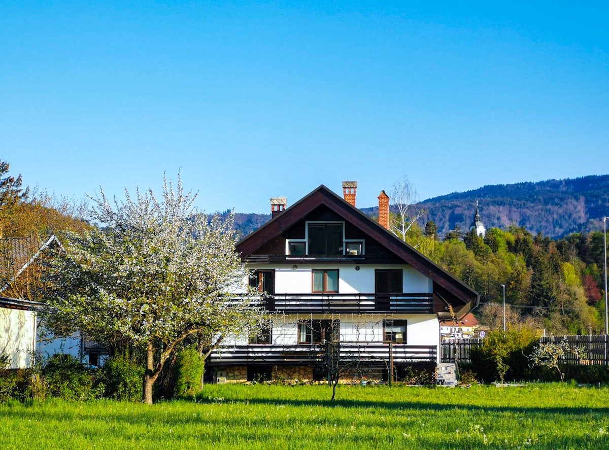 Casa de pueblo cerca del lago Bled con vistas a las montañas.