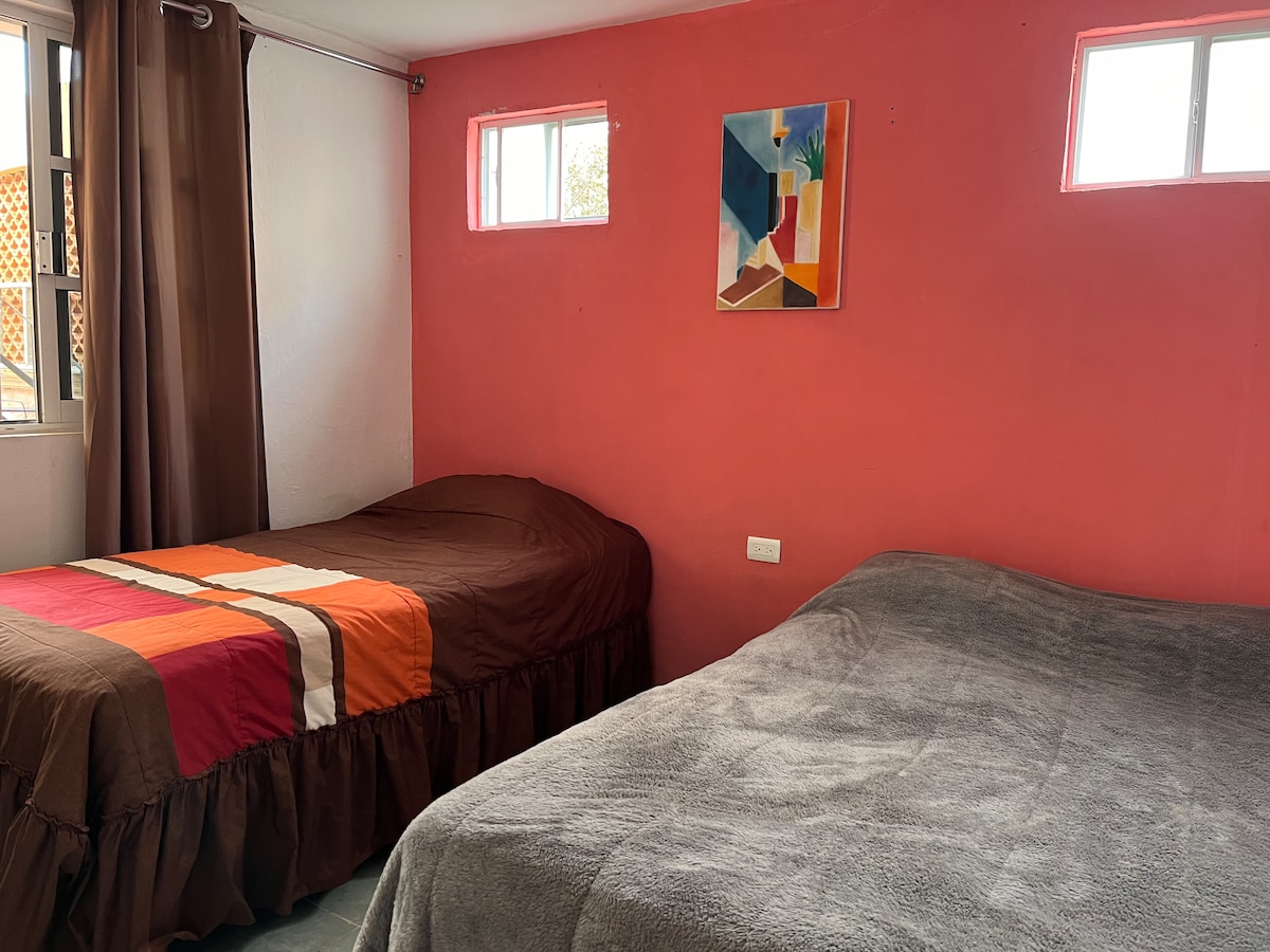 Mini departamento con todos los servicios, cama matrimonial, TV LED 32 plg con cable, Internet de alta velocidad WiFi, Cocineta, baño independiente, posibilidad de uso de las áreas comunes como jardín, asador, cancha de basketball, acceso independiente al departamento. Ubicado en el centro de la ciudad con fácil acceso al transporte público, seguro, limpio y en un ambiente familiar, aislado del ruido exterior, ideal para estudiantes o familias con niños pequeños.