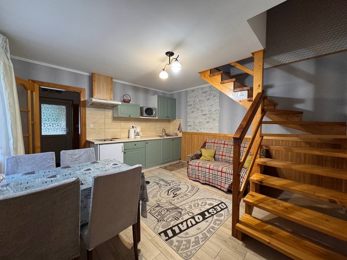 Casa de 1 habitación con un pequeño rincón de cocina (hervidor de agua, cocina eléctrica, microondas, fregadero de agua) y baño propio. Si lo deseas, el anfitrión cocinará platos tan deliciosos de la cocina Hutsul dos veces al día, que te lamas los dedos. La anfitriona Nastya te sacará leche directamente de la vaca o tratará de conseguir la vaca por tu cuenta si lo deseas.