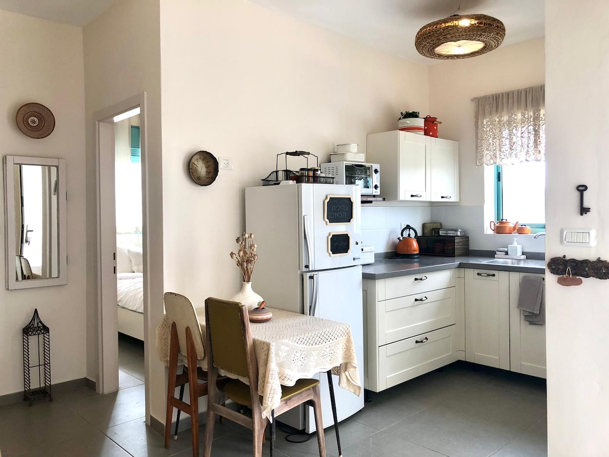 ¡Un nuevo, hermoso y equipado B&B en el corazón de la mágica Yerucham! En la planta baja, estacionamiento adyacente, con un lujoso dormitorio y ducha, TV inteligente, cocina totalmente equipada, balcón con hamacas y patio. Accesible para personas con discapacidad y también equipado para tradicionalistas los sábados y días festivos. ¡Excelente punto de partida para pasar tiempo en la ciudad y hacer senderismo en la zona! Muy cerca del cráter, del lago Yeruham, del campo matutino, de los ojos de Yarkam y Ein Akev, y un poco al sur: el cráter Ramon y sus alrededores. Un lugar tranquilo y acogedor. Llegada el sábado por la noche, una hora y media después del final del sabbat. ¡Nos encantaría verte!