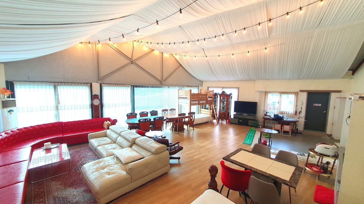 * Servicios básicos - Ofrecemos un té Pu-erh de alta calidad que tiene más de 300 años de antigüedad del Unnamseong de Damma Rawon como té de bienvenida. Si lo solicitas con anticipación, puedes reemplazarlo con una experiencia de té en “Dammadaewon”. - El pan y el café de goteo manual se proporcionan en la propiedad. - Puedes traer tu propia tienda de campaña y montarla en el patio. * Servicios prestados previa solicitud el día anterior (es difícil prepararse el mismo día debido al horario) - Proporcionar un espacio privado de meditación de yoga en Damma Dangwon - Sineyo o experiencia de meditación para padres - Proyector de haz interior, alquiler de pantalla gratuito (se debe traer una computadora portátil personal). - Alquiler gratuito de pizarra para talleres. - Alquiler pagado y configuración de decoraciones para eventos de aniversario y cumpleaños (costos separados incurridos por las empresas afiliadas visitantes). * Hongcheon Vivaldi Park (20 minutos en coche), Yongmunsa (10 minutos en coche), Jungwon Valley (5 minutos en coche) * Descuento por noche consecutiva (10 % por 2 noches, 20 % por 3 noches o más) el día anterior a la visita, Te enviaremos un mensaje para que cambies el monto aplicando el descuento. # Dirección de Instagram: iamforest_airbnb # Dirección del blog: feellove_me