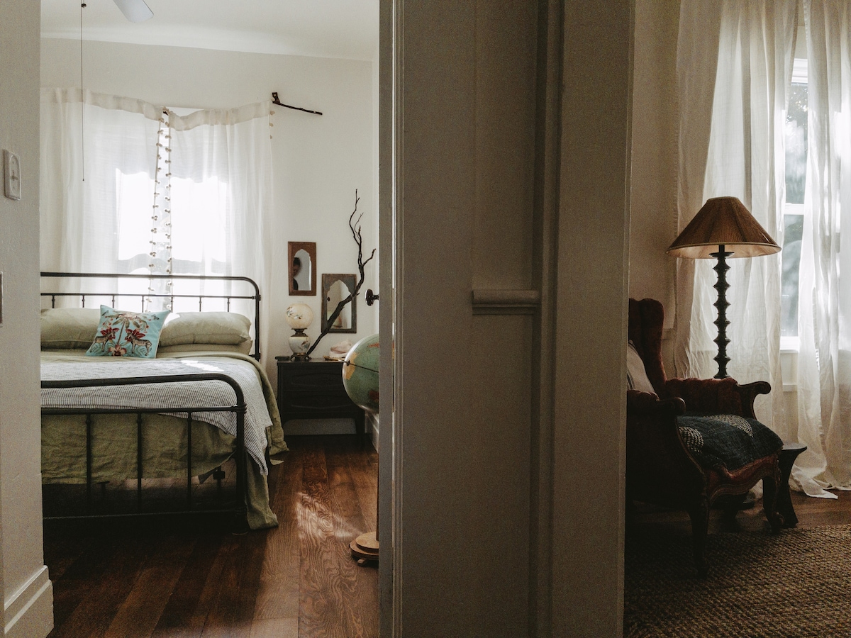 Esta suite privada tiene una entrada independiente con puerta de pantalla, cocina pequeña y baño. El dormitorio tiene una cama de tamaño completo con sábanas de calidad y un cobertor de espuma viscoelástica de 4", chimenea, ventiladores de techo y piso, TV, futón y armario. La cocina pequeña ofrece lo esencial, olla eléctrica y sartén, nevera pequeña, fregadero con triturador de basura y horno microondas/freidora de aire. El baño “tipo spa” cuenta con un cabezal de ducha con efecto de lluvia y una varita extraíble, un banco de teca, artículos de ducha y sábanas limpias.