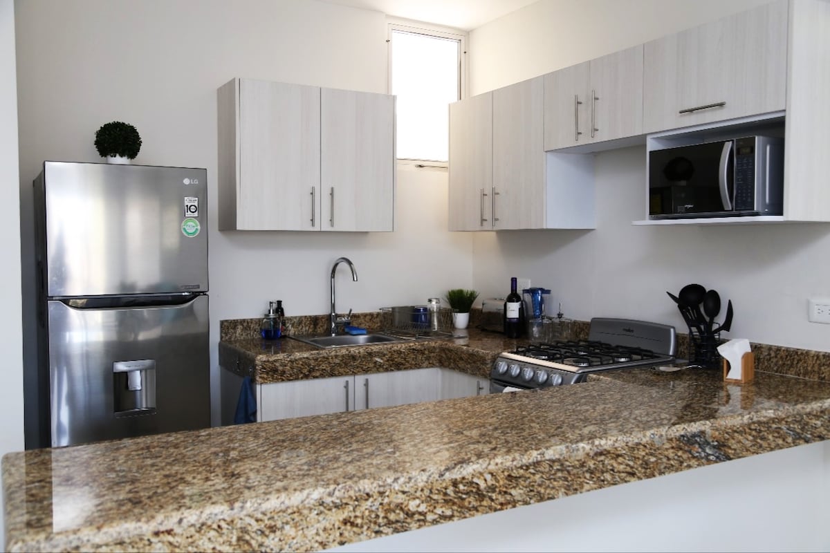 Amplio y cómodo departamento con servicios que te harán sentir como en casa. Está ubicado en una zona muy tranquila que se encuentra a unos pasos del centro de convenciones, restaurantes, bares, plazas comerciales y un supermercado selecto enfrente para que puedas hacer tus compras. Cuenta con cocina equipada, aire acondicionado en las 3 recamaras, TV con fire stick y el WIFI es de 150 Mbps. Tiene un lugar de estacionamiento. El área de sala y comedor solo cuenta con ventiladores no tiene A/C