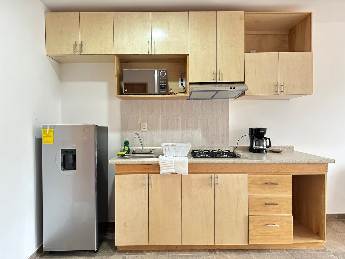 Departamento semiamueblado ideal para 2 personas, ubicado en el 4.º piso. Cuenta con baño con agua caliente, cama matrimonial, cocina equipada con frigobar y comedor. A solo 10 minutos del aeropuerto, es una excelente opción para estadías cómodas y prácticas y a solo 30 minutos del centro histórico de la ciudad Oaxaca de Juárez.