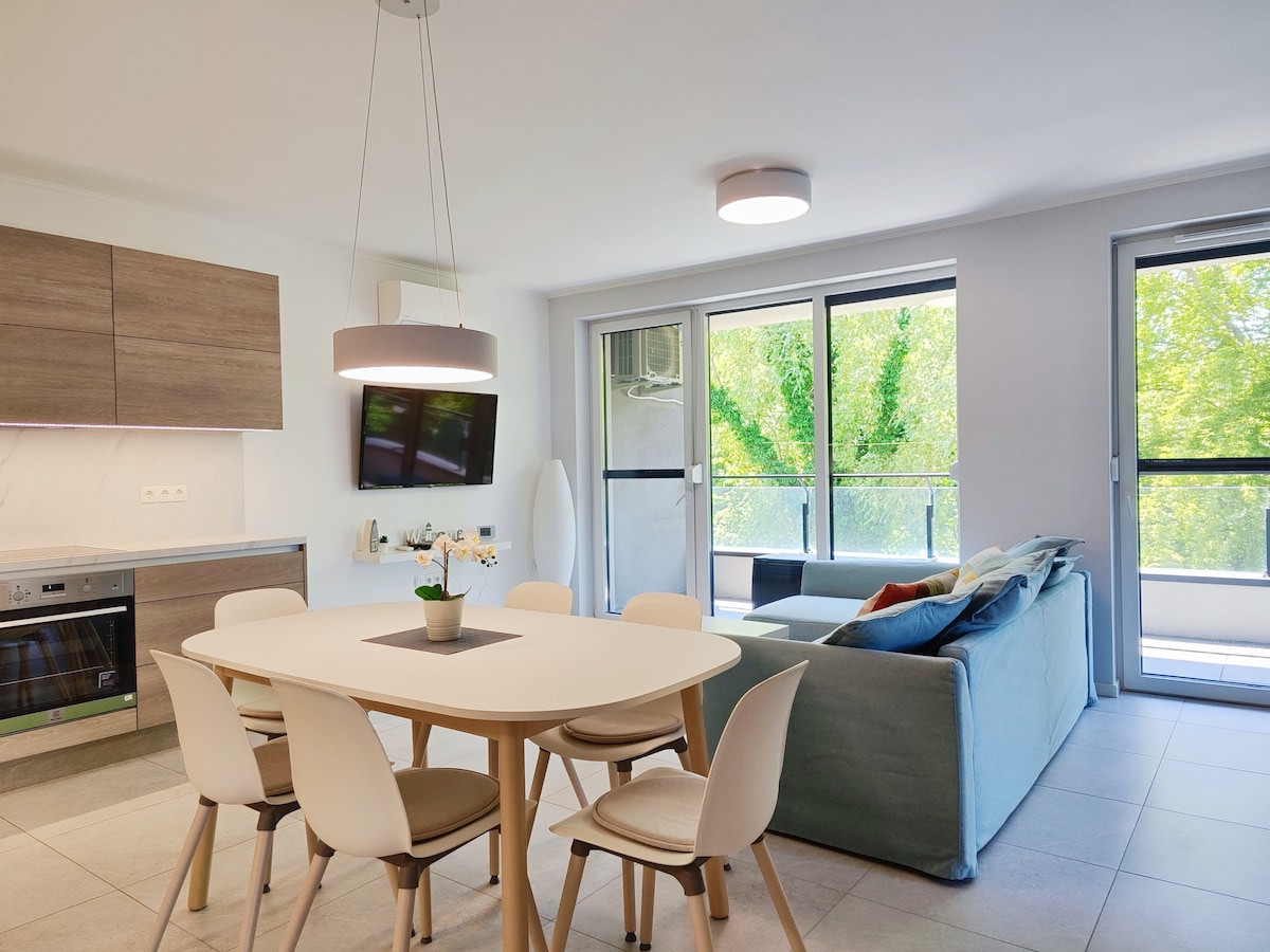 ¿Te gustaría relajarte en un apartamento de lujo verdaderamente único, con un ambiente cercano al agua? ¡Te esperamos en nuestro apartamento equipado con todas las comodidades! ¡A solo 5 minutos a pie del puerto deportivo y de la playa de Libás! Apartamento de 3 habitaciones de nueva construcción, 110 m2, tipo ático, en un parque con árboles centenarios. 67 m2: salón con cocina americana + 2 dormitorios + rincón de trabajo + 1 baño + 2 aseos con 2 WC + recibidor. Terraza circular de 37 m2, con salida independiente desde cada habitación. Internet: 300/150 mb/s ¡Junto al lago Balaton, sin miradas indiscretas!