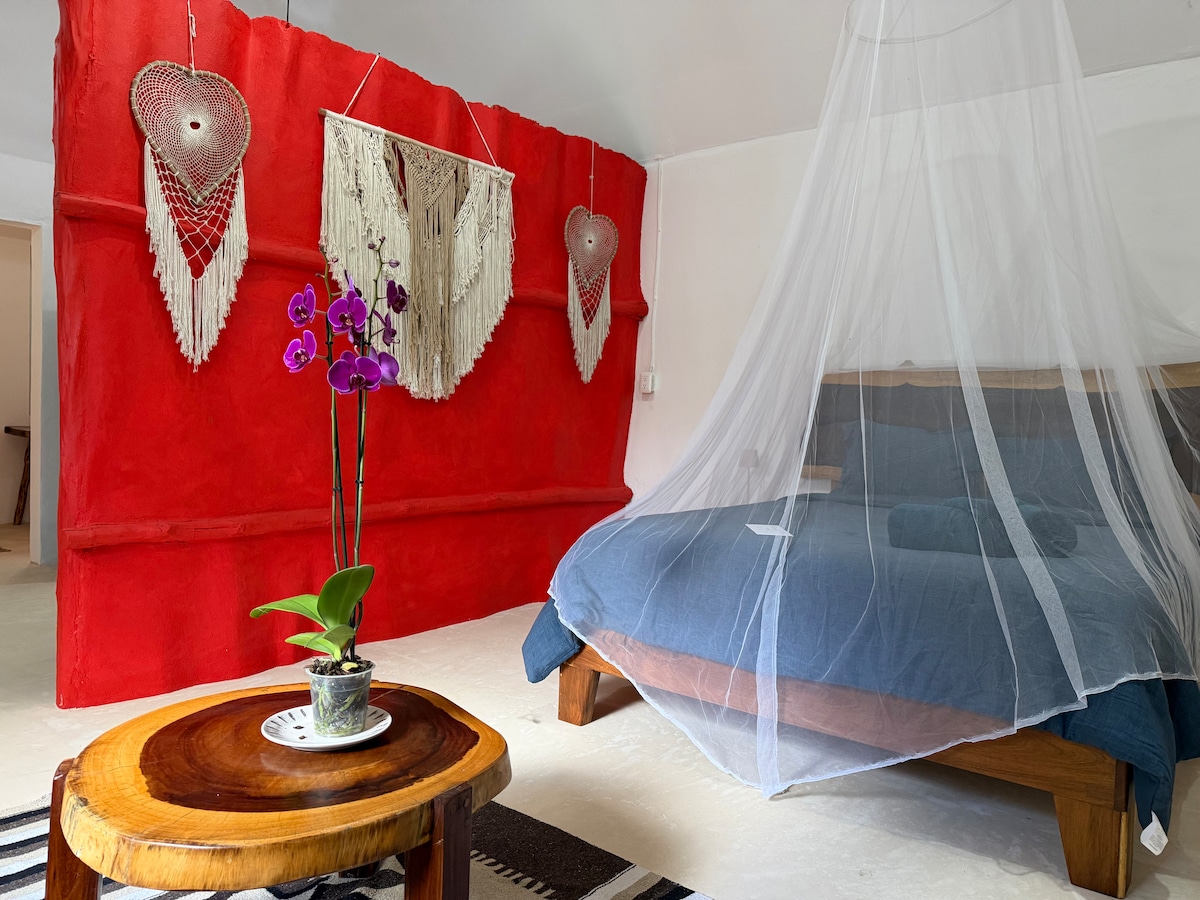 Junto al internacionalmente aclamado retiro de bienestar, Holistika, este espacio rodeado de naturaleza es raro e inolvidable. La casa del árbol Heart Fire Treehouse ofrece lo mejor de dos mundos: los huéspedes pueden bañarse en la naturaleza sin dejar de tener acceso a las atracciones de la ciudad (cafés de coworking, tiendas de comestibles y restaurantes locales e internacionales, la playa y los cenotes, tiendas) a poca distancia a pie, en bicicleta o en coche. Playa = 15-20 minutos en coche *Ten en cuenta que pueden haber obras cerca durante el horario laboral de lunes a viernes.