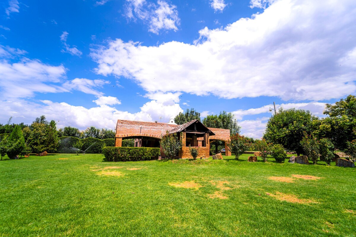 Disfruta de una experiencia diferente en alojamiento. Relájate con el aroma de la madera, contemplando el paisaje y escuchando el trino de las aves, sintiéndote en contacto con la naturaleza. Te ofrezco amplia cabaña hecha de madera, estilo canadiense, cómoda, equipada y con amplios espacios ajardinados y palapa con asador, para una relajante convivencia, a sólo 15 min del perímetro ferial, y a solo 10 km. de segundo anillo, sobre la salida a Calvillo. Fácil acceso, zona muy tranquila.