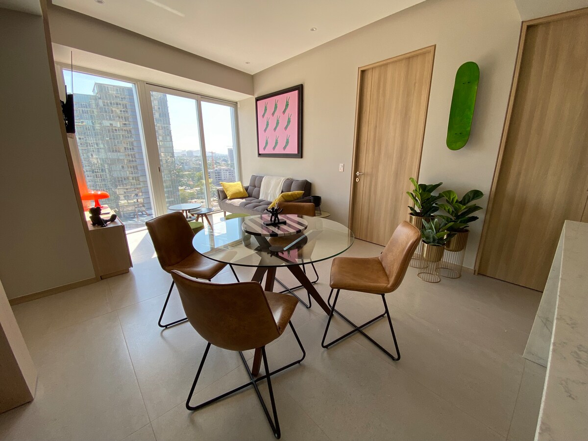 Nuevo y moderno edificio con la mejor ubicación, el departamento cuenta con una vista panorámica espectacular! La ubicación privilegiada estamos a 10 min de Plaza Andares a 10 min del centro de la ciudad a 5 min de Chapultepec a 10 min de la Expo y a 5 min de Providencia. Seguridad 24 hrs. El departamento está decorado y equipado por diseñadores para que vivas una experiencia confortable durante tu estancia. Aire acondicionado independiente disponible en cada habitación y en área común.