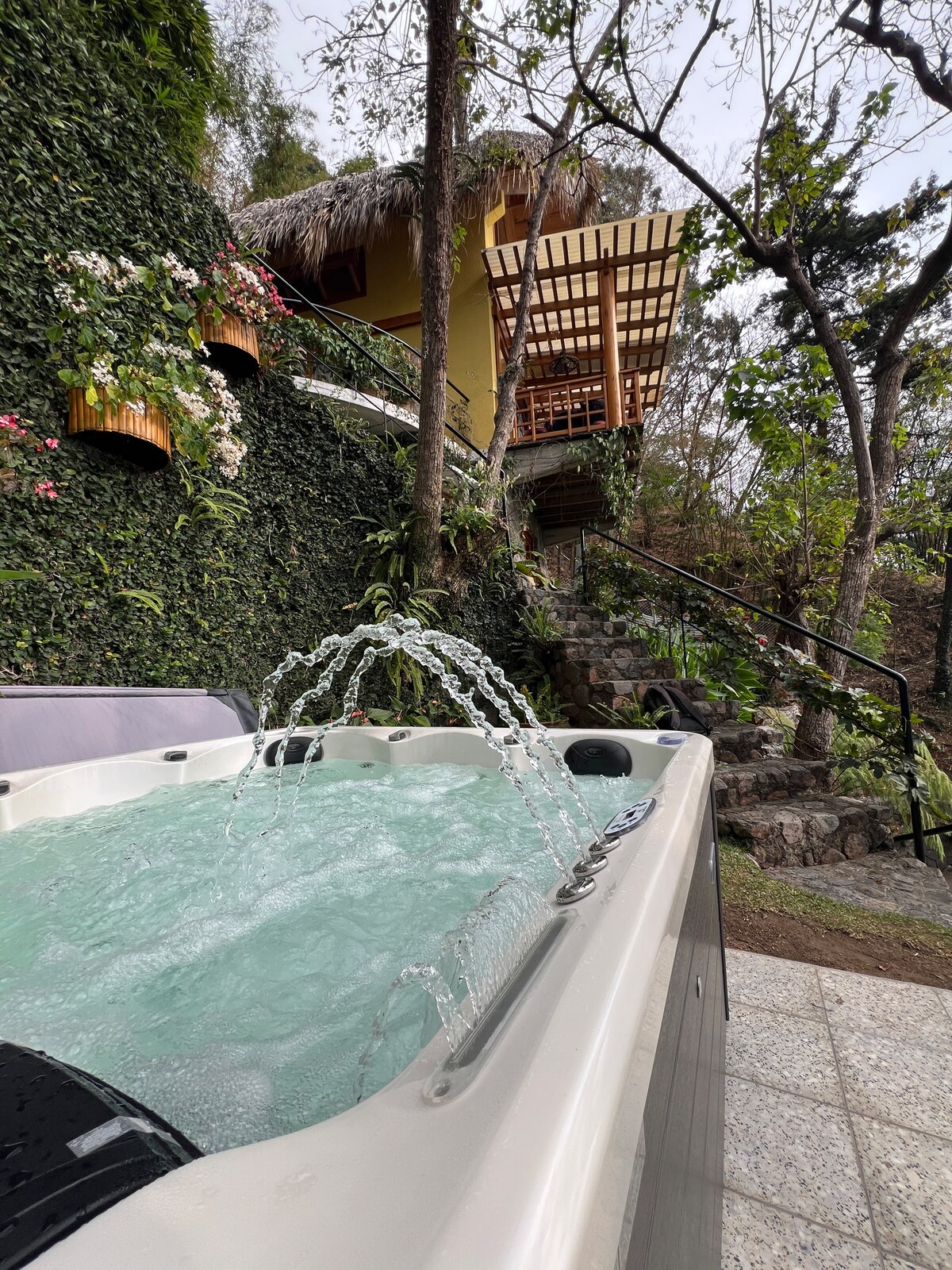 Hermosa cabaña privada en medio de la naturaleza. Ideal para pasar un rato relajante, observar aves o hacer una escapada. Hermosos paisajes y vistas al volcán de Fuego, al volcán de Agua y al volcán de Acatenango. Hasta 12 huéspedes, tiene jacuzzi, terraza y chimenea.